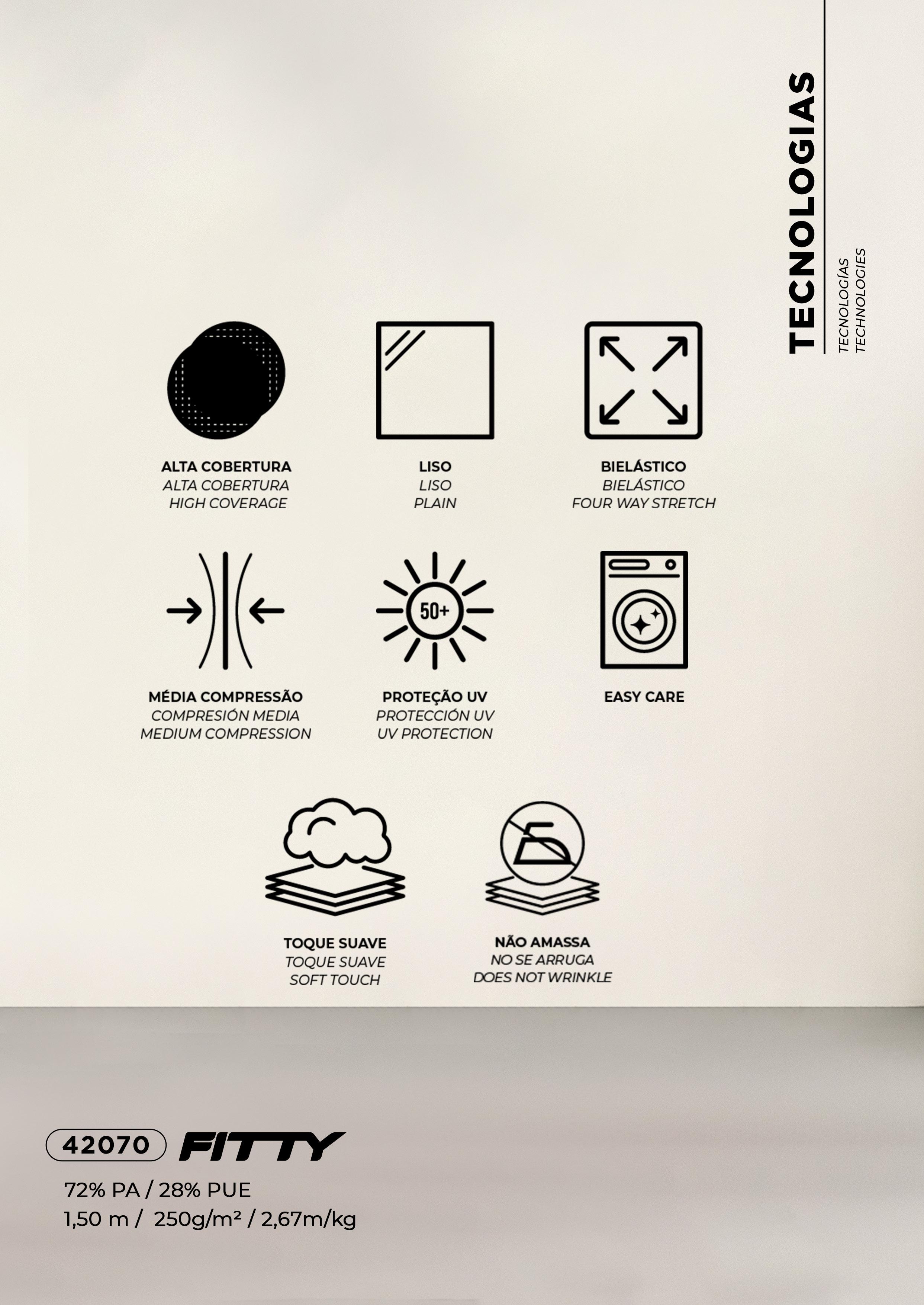 Fitty has high stretch and return power, UV50+ sun protection, high coverage and fabric resistance that adapts to different bodies and maintains the ideal compression for various uses in the collection, from sportswear to lifewear.