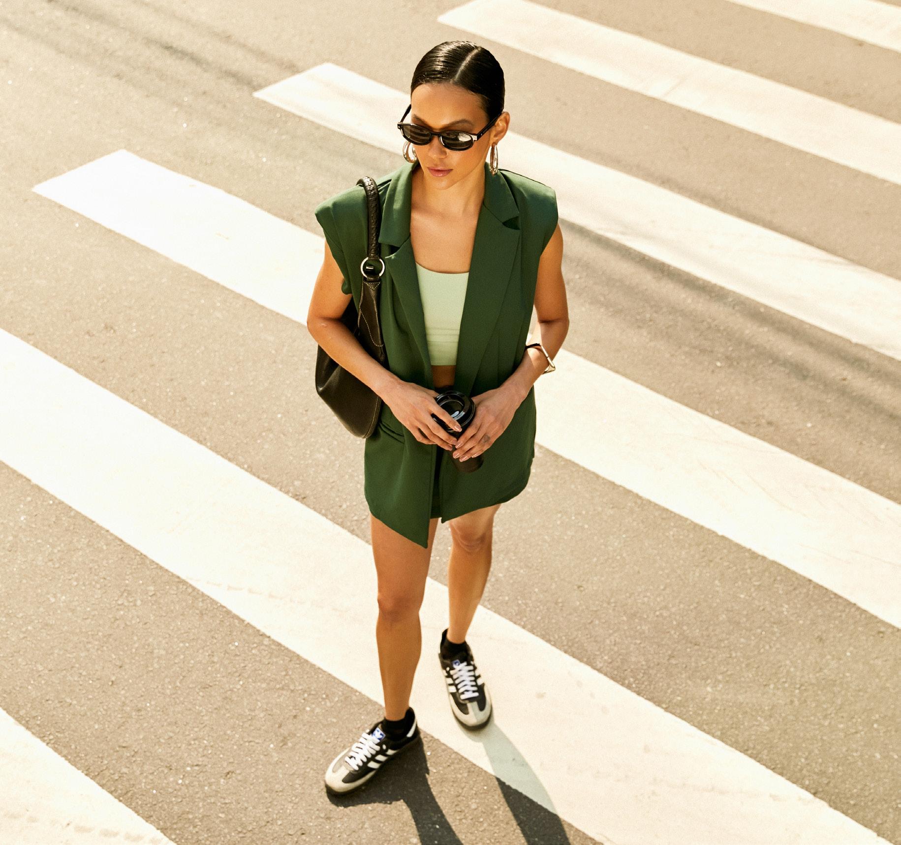 Traços geométricos conectam os universos esportivo e casual, criando um estilo versátil e adaptável a diversas ocasiões.