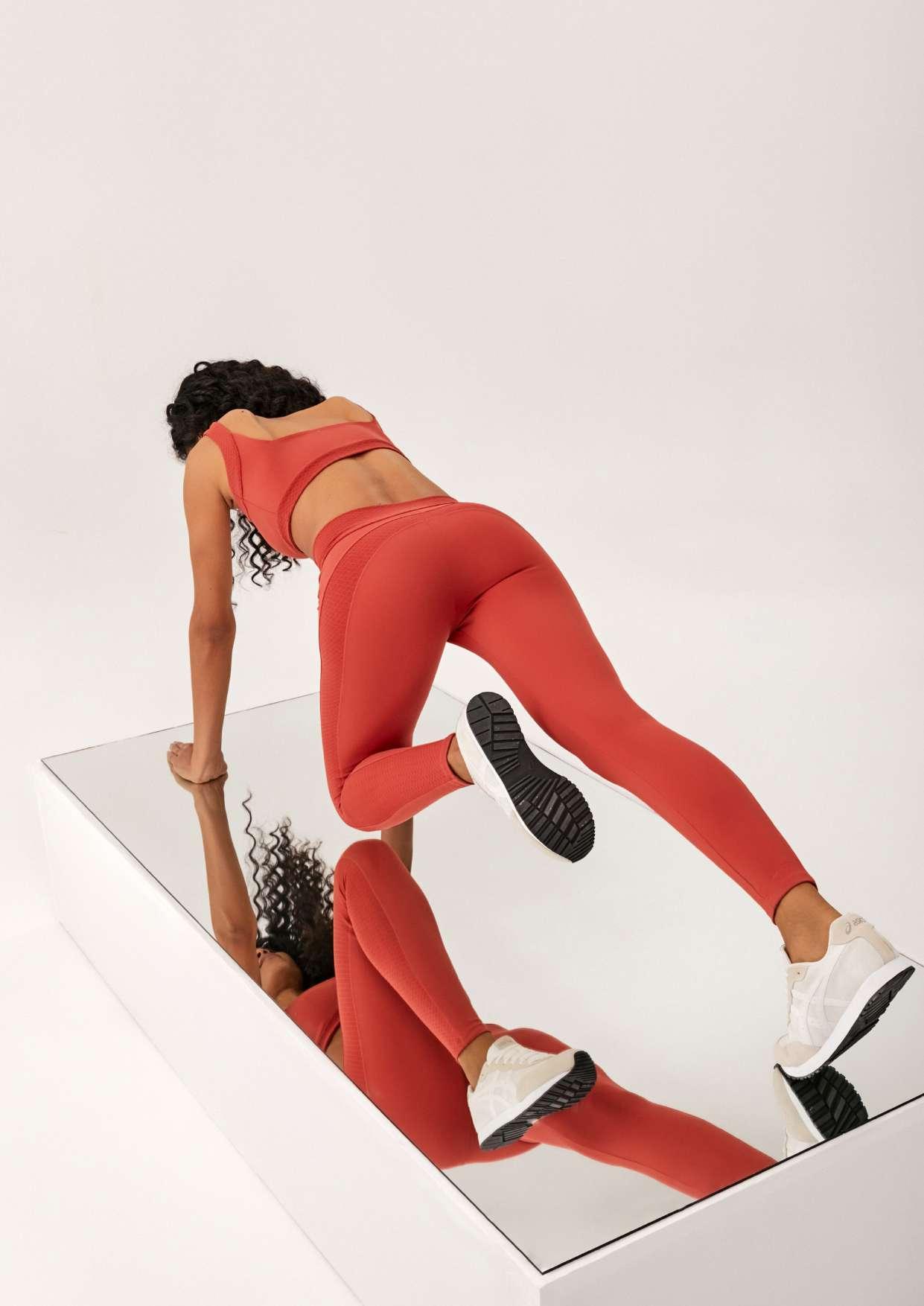 Sua construção remete à estrutura ketten oferecendo elasticidade bidirecional e compressão na medida certa.