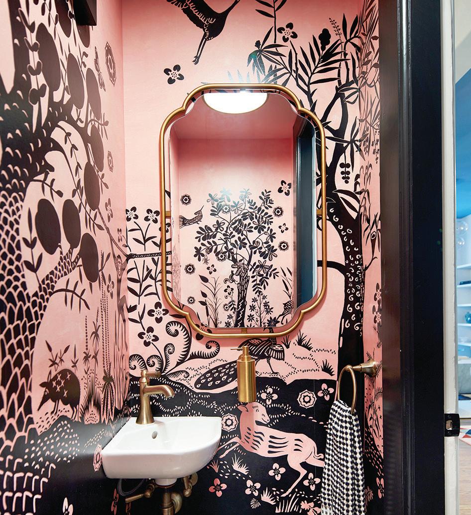 A tiny powder room got an exuberant pink-and-black, animalprint wallpaper. In a tight hallway next to a window, there’s a kaleidoscopic wallpaper, an abstract rug and a Basquiatpatterned chair.