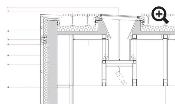 Clarabóia com vidro duplo Grades de aço Corten ajustáveis Chapeamento de aço Corten Suporte em inox com isolamento térmico Concreto reforçado Chapa de aço pintada Fixação em aço galvanizado