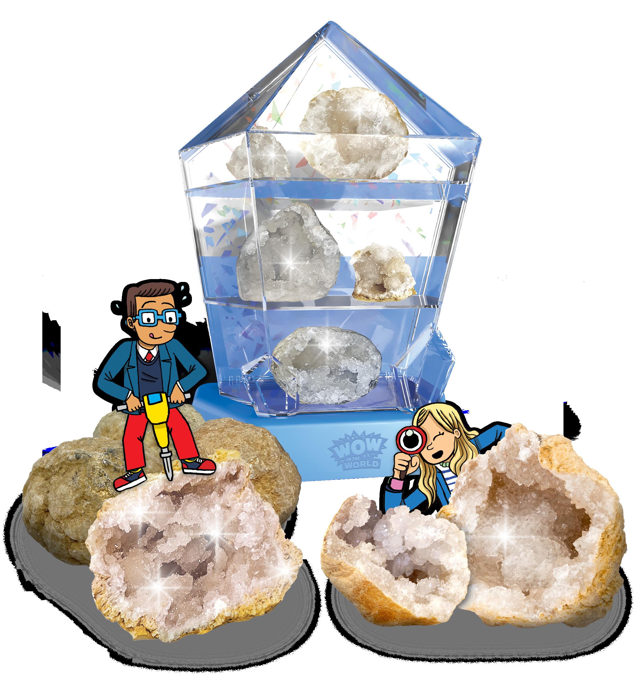A fun, eight-page, full-color experiment guide takes you through cracking open the geodes and provides exciting educational content about these amazing natural wonders. Scan the QR code to access exclusive podcast content including scientific info about how geodes form and fascinating facts about geodes, all explained by Wow in the World’s Guy Raz and Mindy Thomas!