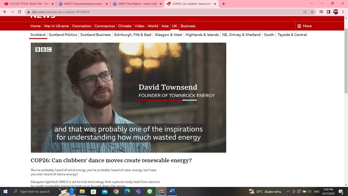 BBC News (2564) COP26: Can clubbers' dance moves create renewable energy? , สบคนเมอ วนท 4 เมษายน พ.ศ.2566, ทมา : https://www.bbc.com/news/av/uk-scotland-59194559