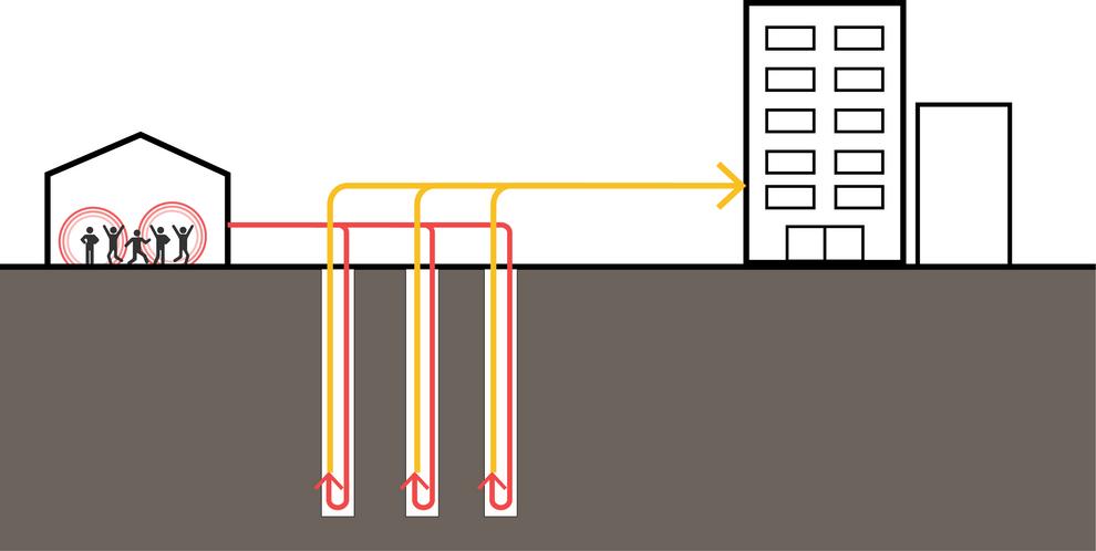 บนเทง เปนการนาพลงงานความรอนเหลอทง (Waste heat) จากการเตนของคนจานวนมากในคลบ ไปเกบไวใน หลมใตดน (Boreholes) กอนทจะปรบเปลยนมาเปนพลงงานหมนเวยนเพอใชภายในคลบ ซงเปนเทคโนโลยใหม