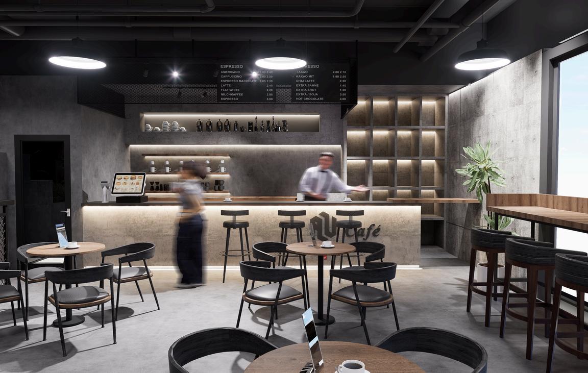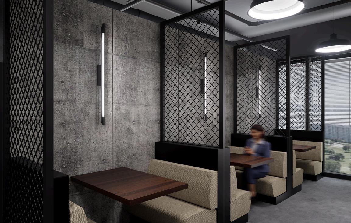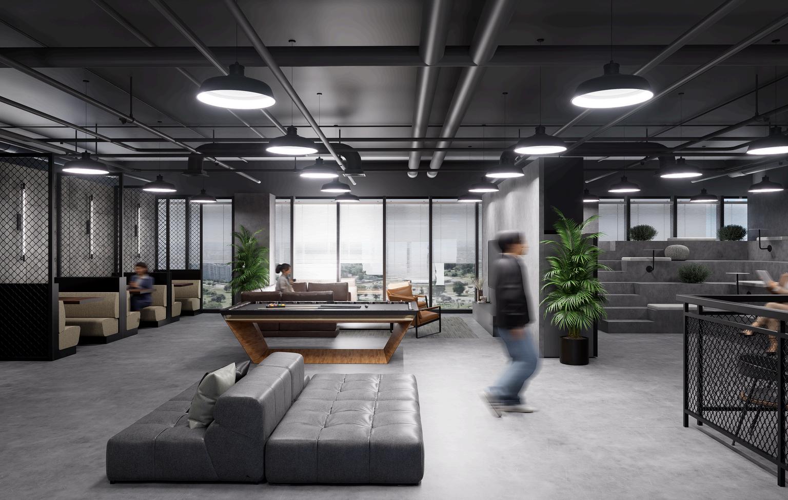 This industrial co-working space uses concrete, steel, and mesh for a bold look, softened by wood and fabric. The layout flows naturally between work and social areas, supporting focus, collaboration, and relaxation—turning work into a lifestyle.