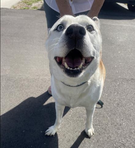 This is Franky - He is about 9 years old, unsure of exact age since he was a rescue. Franky has 1 blue and 1 brown eye. He’s super friendly and loves lounging around and walking with mom, Linda.