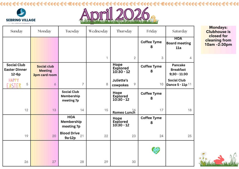 If you are leaving us for the summer, all the staff at Sebring Village wishes you a safe trip. We look forward to seeing you later in the year. Before you leave, make sure your home is secure and store any items that could become dangerous in high winds inside your home or make sure they are tied down. If you have shutters or awnings, close them up before you go. For those of you who are staying, we look forward to seeing you around the community.