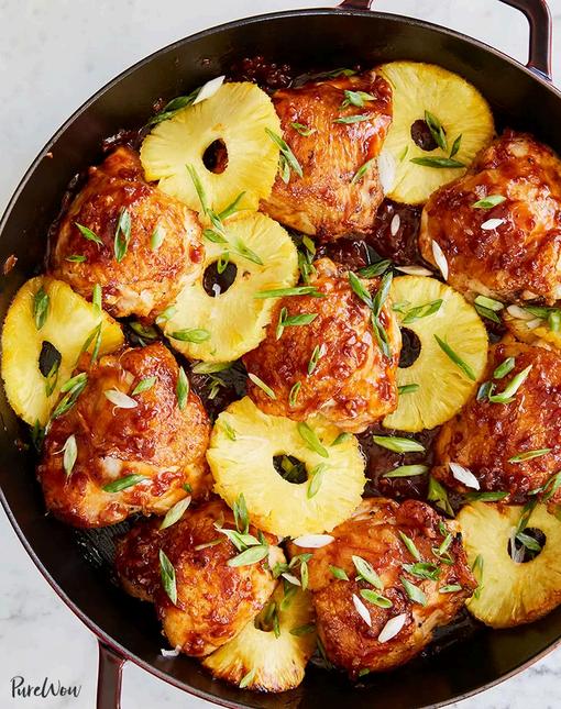 5. Return the chicken to the skillet, skin side up, and arrange the pineapple in the skillet. Transfer the skillet to the oven and cook until the chicken is cooked through and the sauce has thickened a bit more, 12 to 17 minutes.
