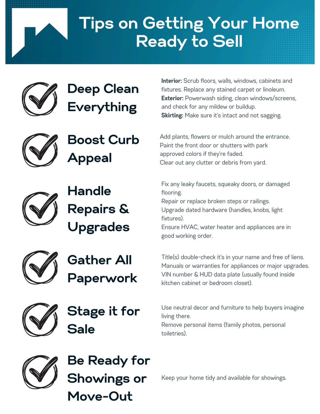 All prospective buyers need to complete the background application before any final sale and receive approval from our Corporate Office. The office must be notified of any sale before it is final, regardless of whether they are past or current residents Community paperwork must be completed All sales will have a 4-sided inspection completed through our Corporate Office to ensure buyers agree to any rule compliance issues