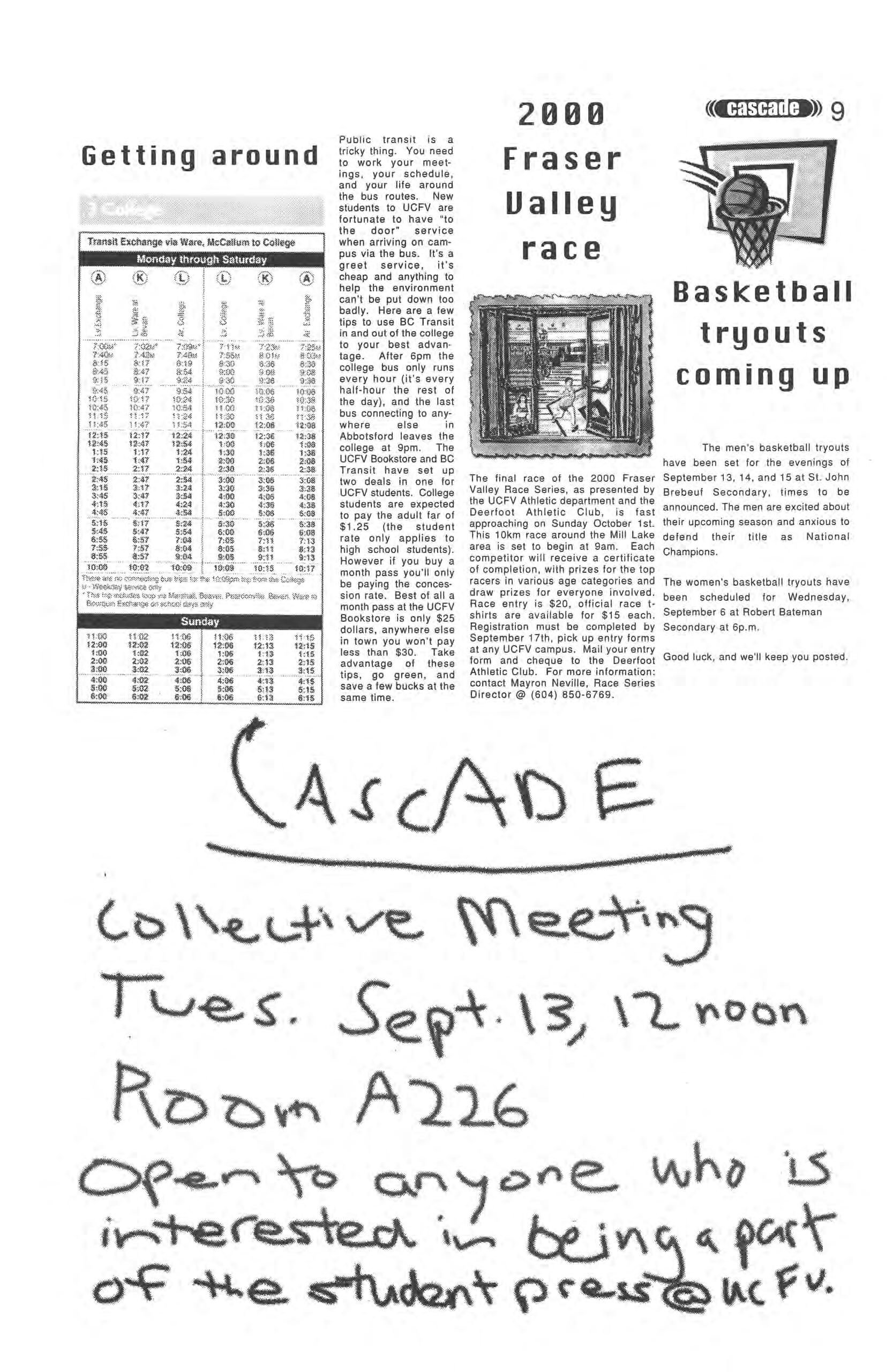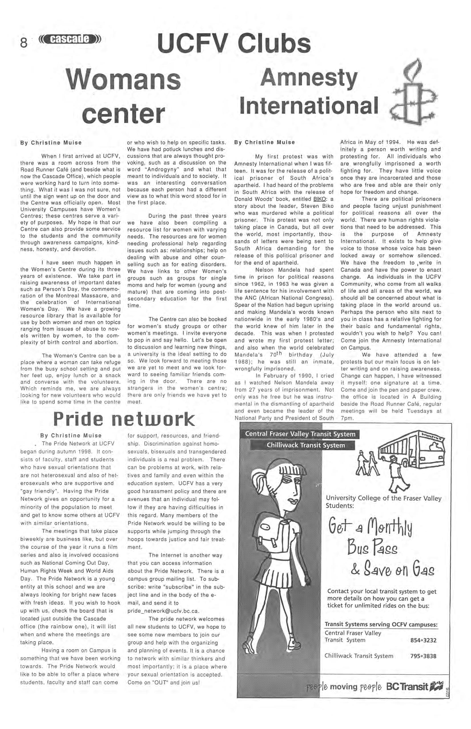 transit is a tricky thing. You need to work your meetings, your schedule, and your life around the bus routes. New students to UCFV are fortunate to have "to the door" service when arriving on campus via the bus. It's a greet service, it's cheap and anything to help the environment can't be put down too badly. Here are a few tips to use BC Transit in and out of the college to your best advan-· tage. After 6pm the college bus only runs every hour (it's every half-hour the rest of the day), and the last bus connecting to anywhere else in Abbotsford leaves the college at 9pm. The UCFV Bookstore and BC Transit have set up two deals in one for UGFV students. College students are expected to pay the adult far of $1.25 (the student· rate only applies to high school students). However if you buy a month pass you'll only be paying the concession rate. Bes,t of all a month pass at the UCFV Bookstore is only $25 dollars, anywhere else in town you won't pay less than $30. Take advantage of these tips, go green, and save a few bucks at the same time.