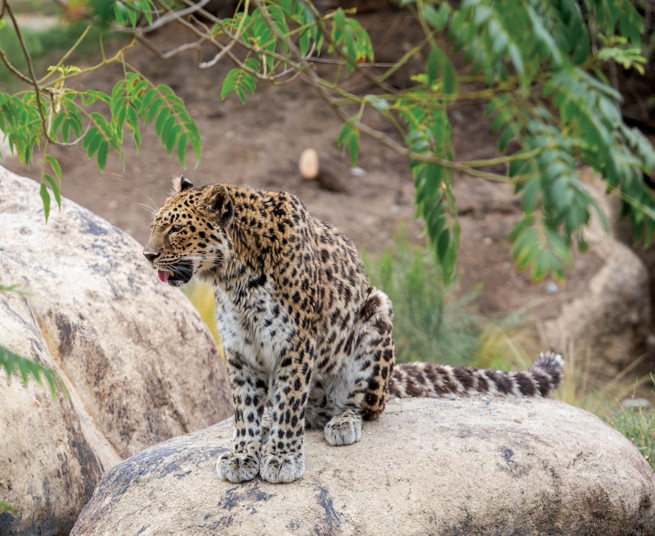 Zoya, an amur leopard, is 21 years old — surpassing the median life expectancy of her counterparts in the wild (10-15 years) and in human care (15-20 years). Despite her age and decreasing kidney function, Zoya is very spry and athletic, able to navigate her habitat with ease — often jumping up high for a better vantage point. Learn more about her care and training by scanning the QR code on the next page.