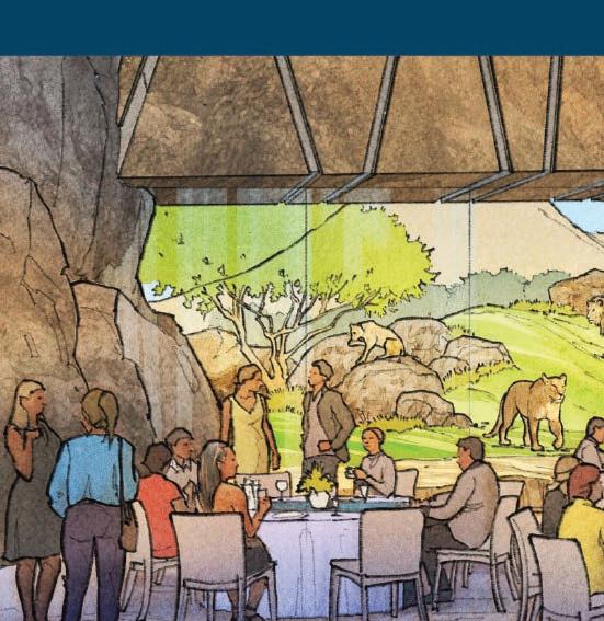 This premier 500-seat, climate-controlled ballroom will be the first of its kind anywhere in the world, o ering panoramic floor-to-ceiling windows into the Lion Ridge habitat, a one-of-a-kind experience for event guests, and a unique point of distinction for The Living Desert. With indoor-outdoor flexibility, state-of-the-art technology, and unparalleled scenery, the Event Center will not only generate vital revenue to support our mission, but also create a new space for dialogue, learning, and connection. These events will deepen community engagement, diversify income, and reinforce the Zoo’s financial sustainability.