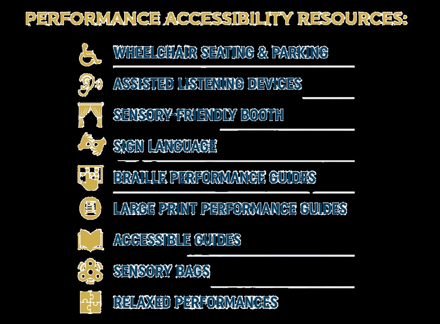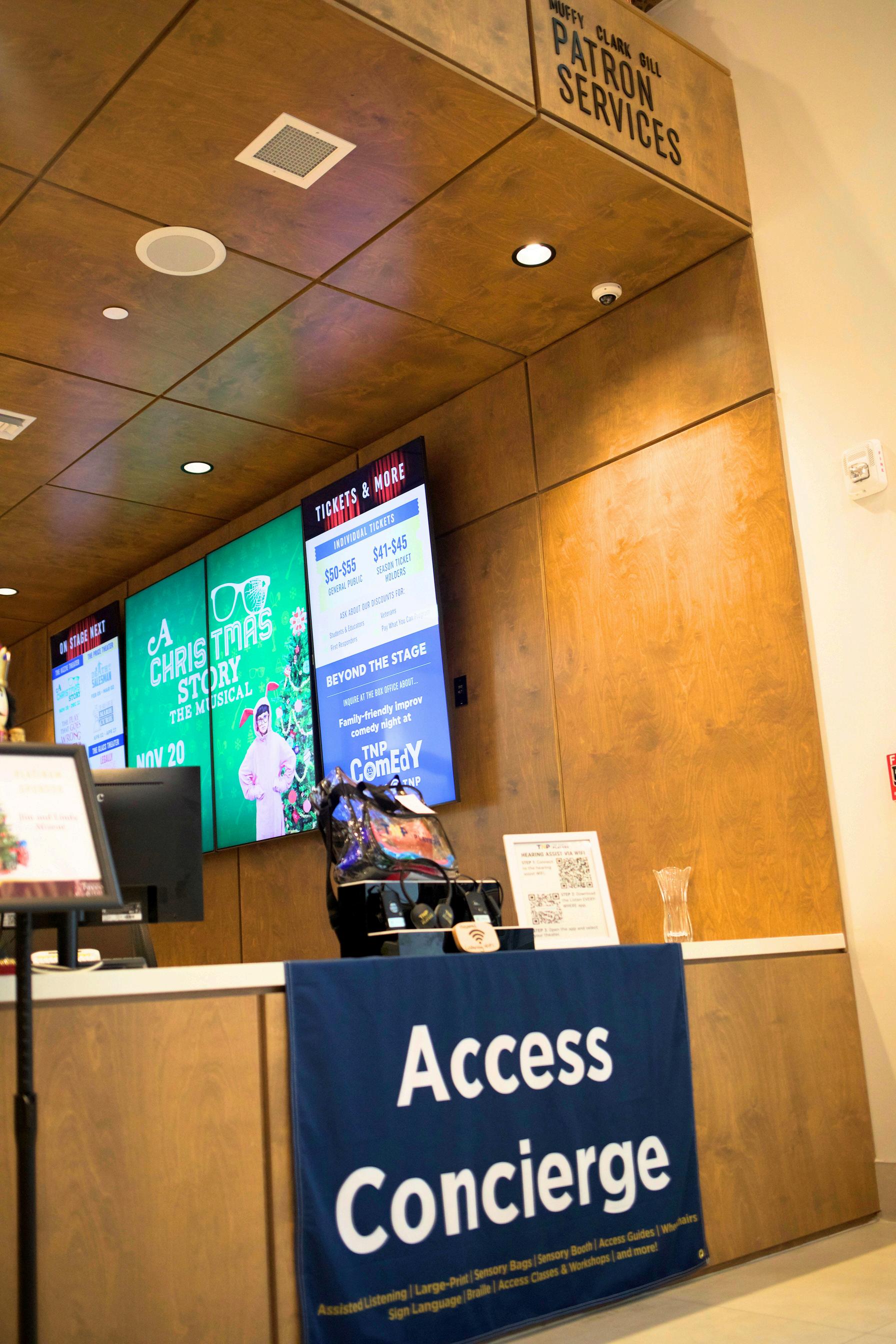The Access Concierge located at the Box Office Patron Services Desk can help me with any accessibility resources I may need. They have assisted listening devices, Sensory Bags, show guides, and more.