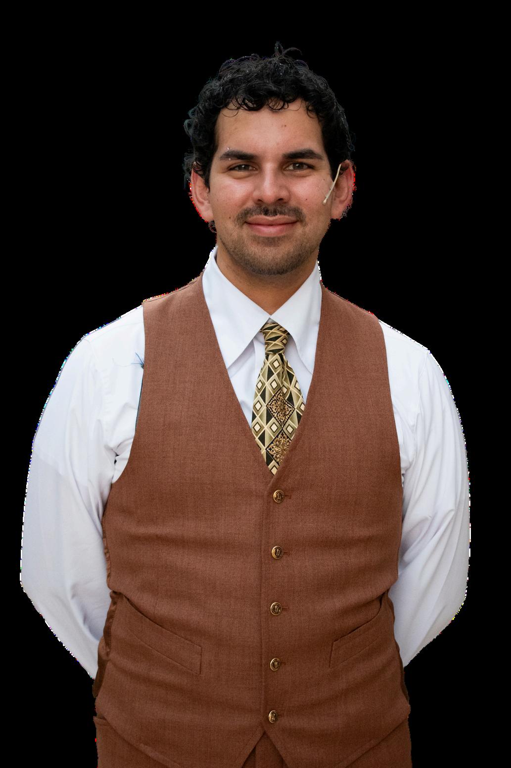 As I walk into the building, I will be greeted by an usher. An usher is a friendly volunteer of the theater who I can go to if I need help. I can tell if someone is an usher by what they are wearing or if they have a name tag on. Ushers will be wearing a white shirt, black pants, and a blue scarf or tie around their neck.