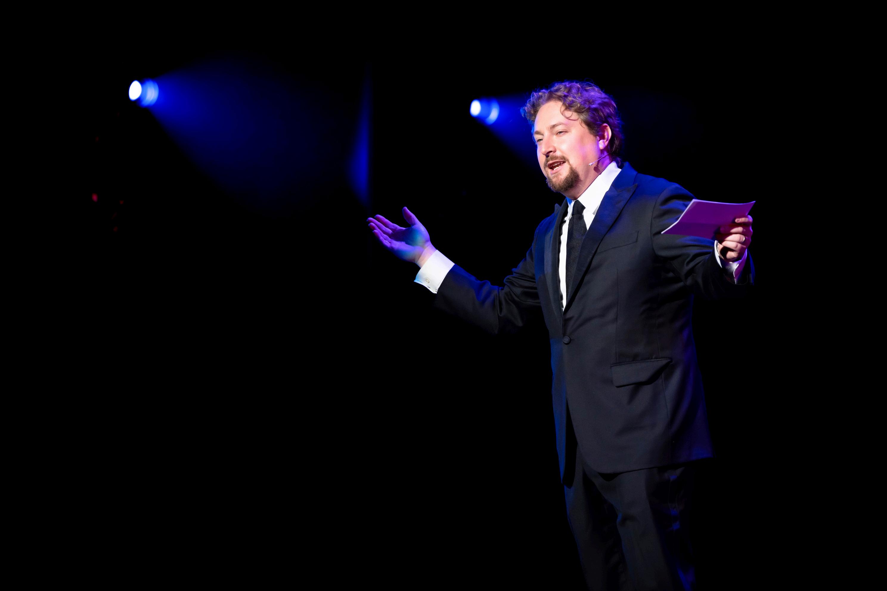 Someone will then come onstage and make an announcement or an opening video will play. This will tell the audience information about the show and our sponsors.