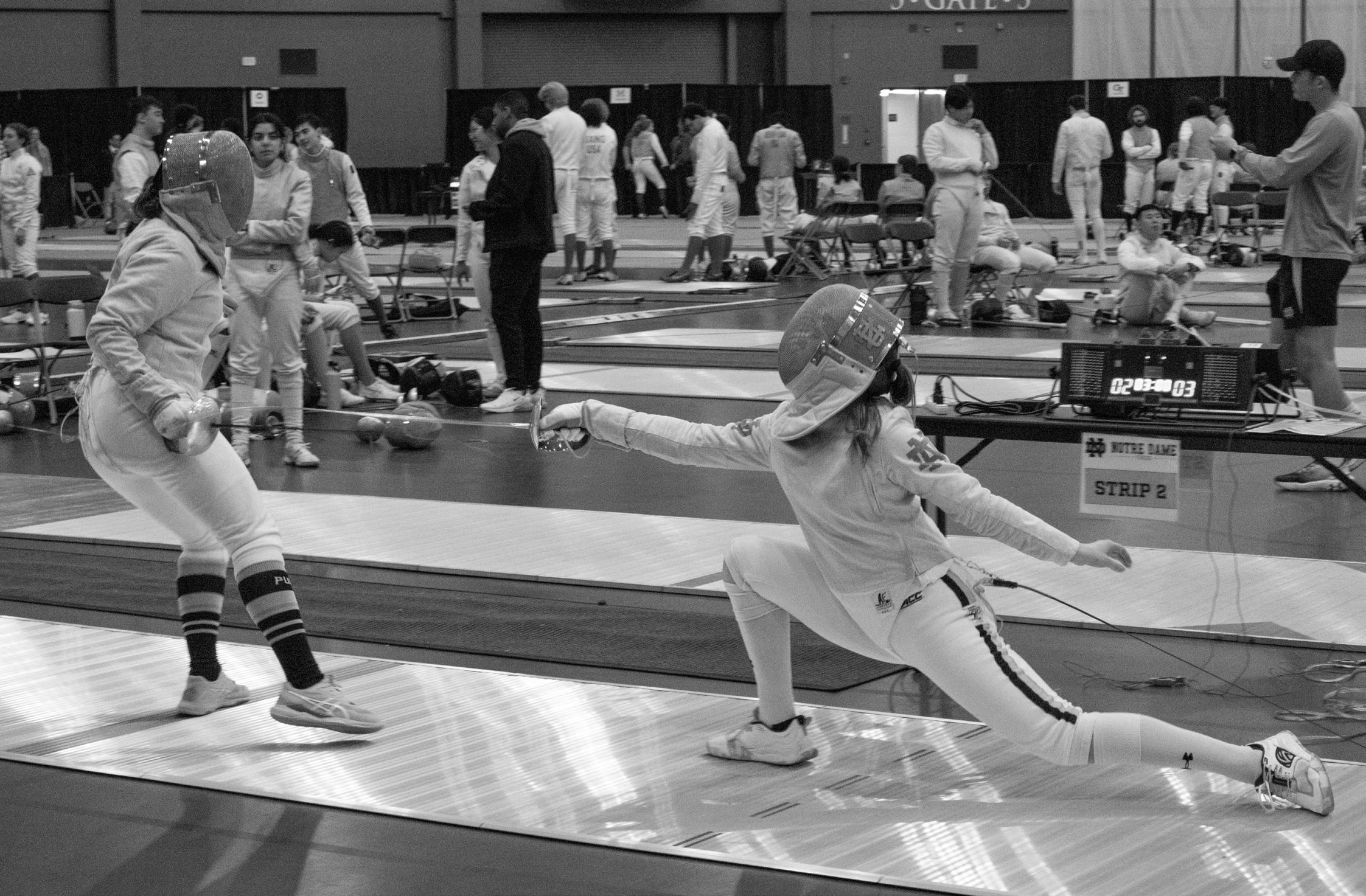 Notre Dame fencing hosted their first and only tournament at home this past weekend, the DeCicco Duals, going undefeated on both days to finish 29-0. Pictured is a member of the Notre Dame women’s sabre team (right), which beat the Purdue Boilermakers 7-2.