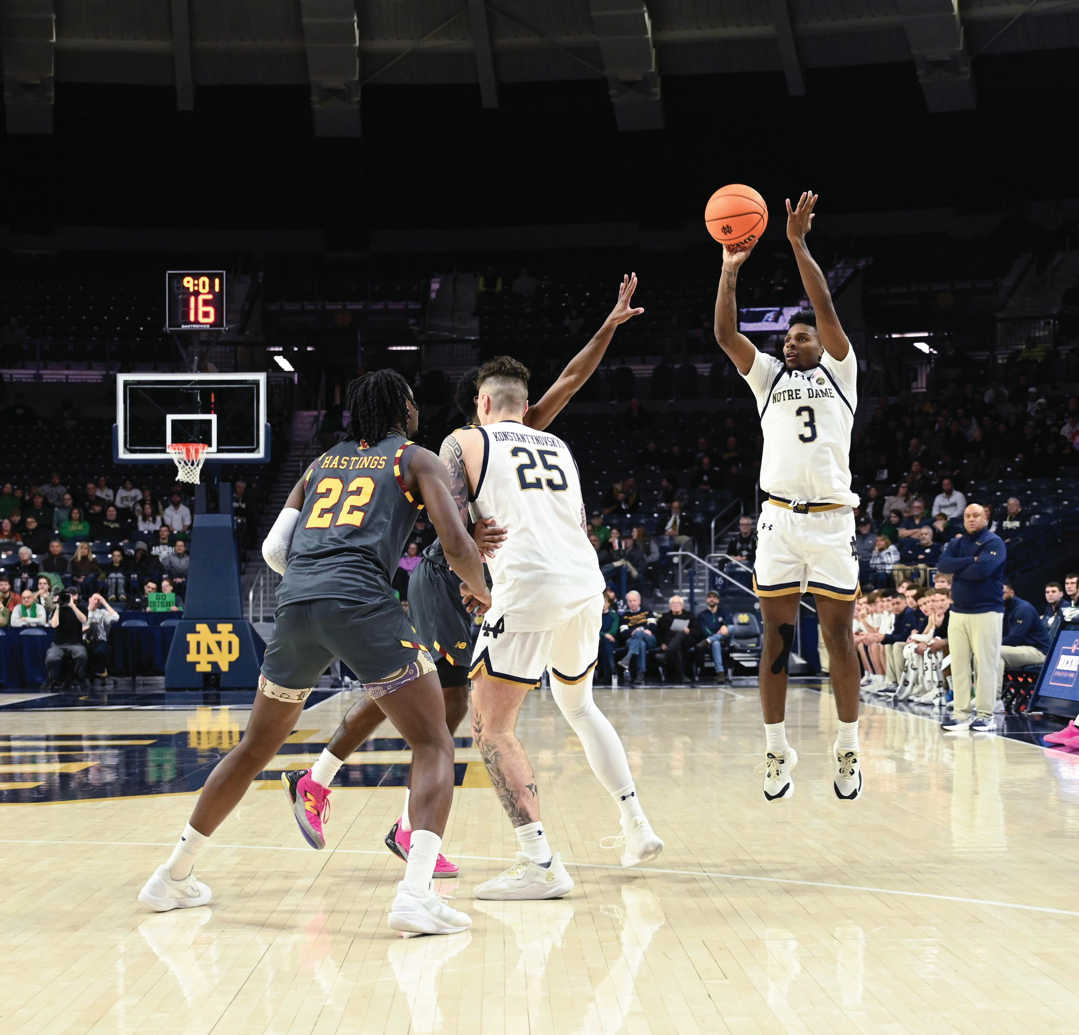 Sophomore guard Markus Burton (3) lets go of a three-pointer from behind a screen from graduate forward Nikita Konstantynovskyi (25) during Notre Dame’s 78-60 defeat of Boston College at Purcell Pavilion on Jan. 13, 2025. Burton has scored 20 or more points in four straight games.