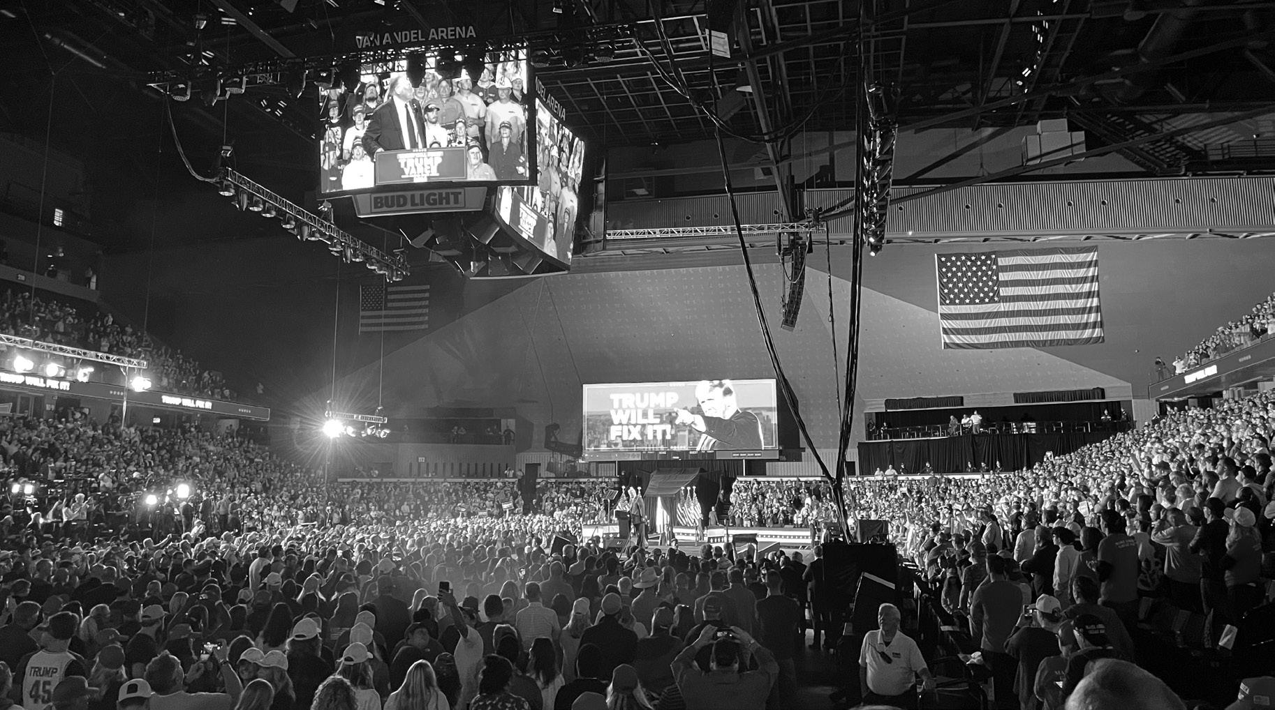 “God Bless the U.S.A.” played, as is customary at Trump rallies.