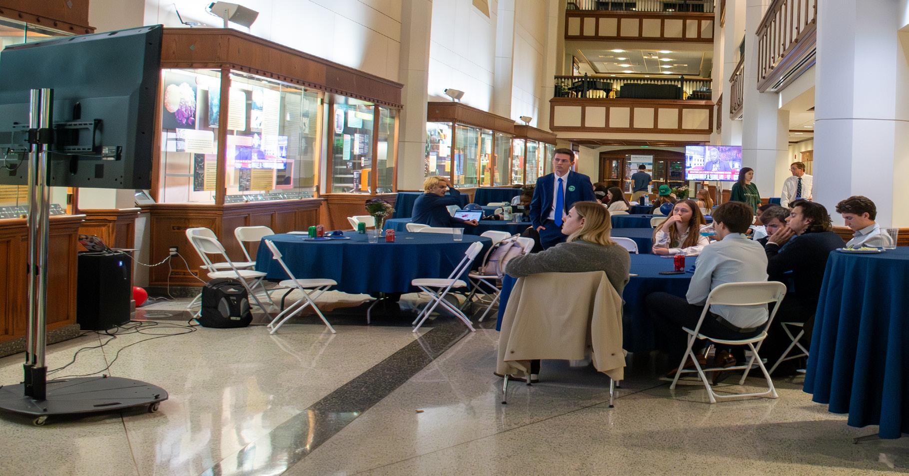Attendees of the College Democrats watch party viewed MSNBC’s live election broadcast on two large screens, with seating in between. Students enjoyed the provided refreshments while discussing the results.