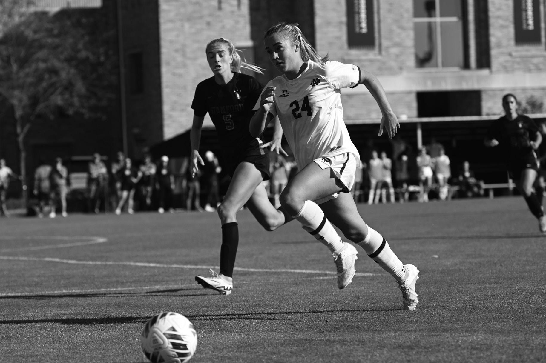Freshman midfielder Grace Restovich runs after the ball during Notre Dame’s 3-0 defeat of Stanford at Alumni Stadium on Oct. 20, 2024. The Irish are 11-3-4 on the season heading into the NCAA Tournament.