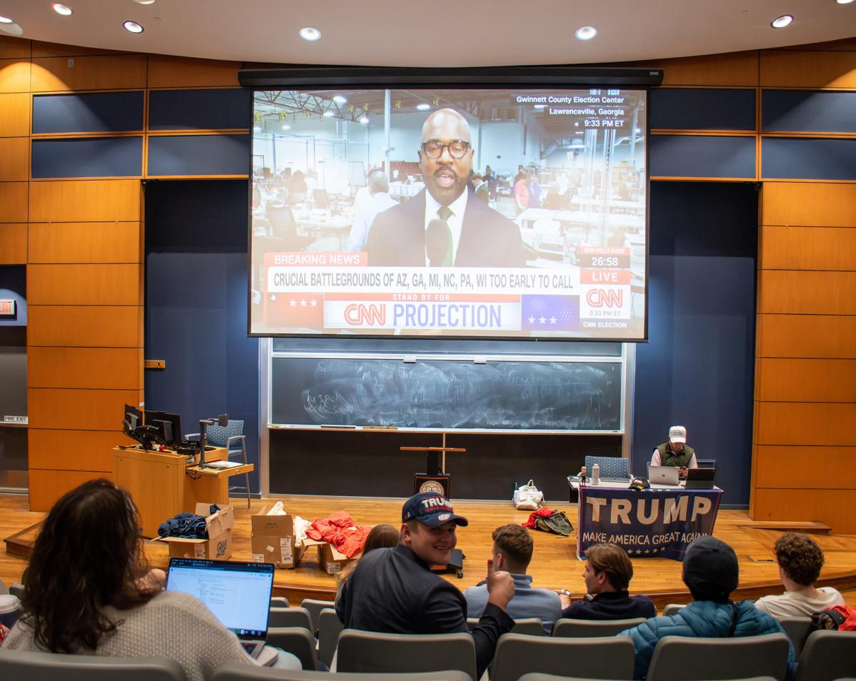 The College Democrats gathered in formal attire for a watch party, as students awaited the election results with anticipation. The event featured MSNBC’s live broadcast on two large screens, providing a central space for around 35 students to follow the unfolding results.