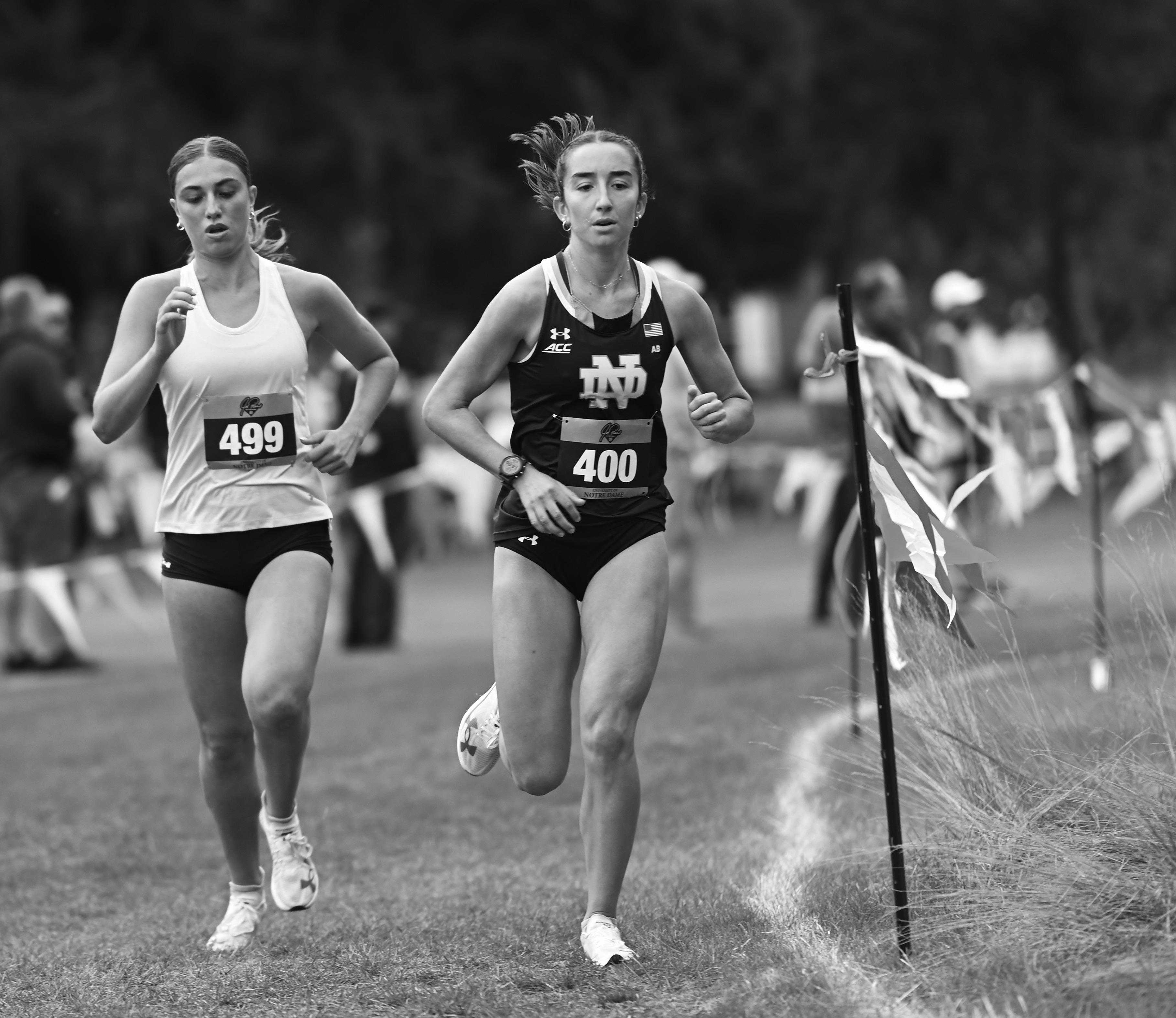 A Notre Dame cross country runner turns the corner during the Joe Piane Invite, held at the University of Notre Dame on Oct. 4, 2024. The Notre Dame women’s team claimed its first ACC Championship on Friday, dethroning NC State after an eight-year Wolfpack run atop the conference. The men’s team, meanwhile, finished in fifth place at the conference meet.