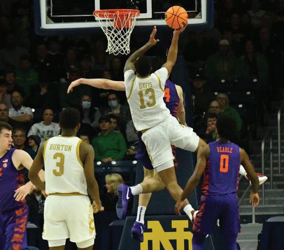 Junior forward Tae Davis elevates for a layup during Notre Dame’s 69-62 defeat of Clemson at Purcell Pavilion on March 2, 2024. The Clemson game marked Notre Dame men’s basketball’s marquee win of the 2023-24 season, as the Tigers would go on to the Elite Eight. Overall, the Irish went 13-20 in their first year under head coach Micah Shrewsberry.