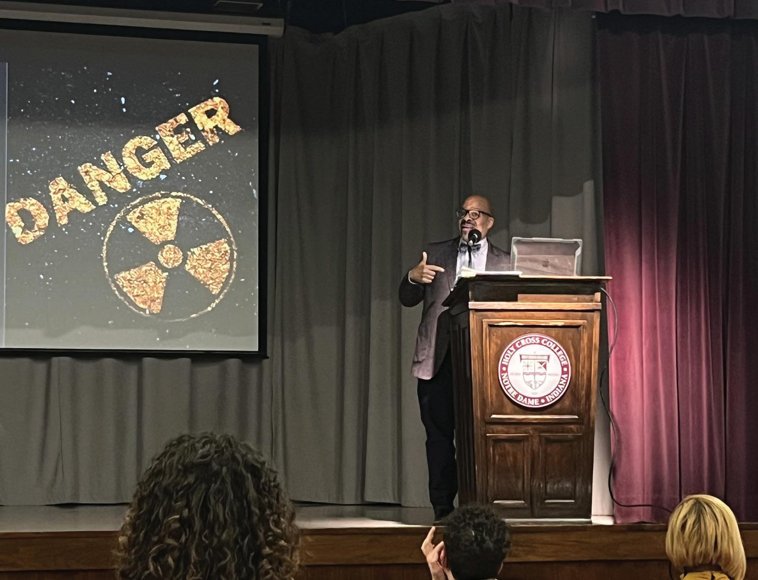 The public lecture in Holy Cross’s Driscoll Auditorium was co-sponsored by Saint Mary’s College’s Division for Inclusion and Equity and Holy Cross College.