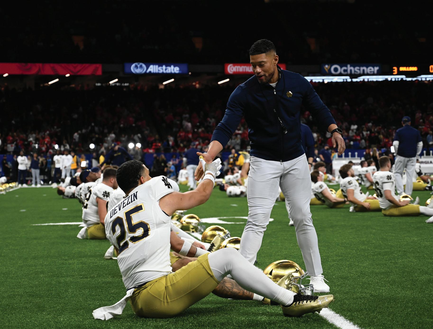 His answer: a 10-game win streak outscoring opponents by a combined 314 points. In that span of games following the NIU loss, Notre Dame delivered the worst loss of the season to each team they played barring Virginia and USC. While the schedule was straightforward, the Irish did more than beat who was in front of them, they ran them off the field. After finishing the year 11-1, Notre Dame earned the No. 7 seed in the CFP playoff, matching up with No. 10 Indiana in the first round. The first postseason home game in college football history would be in Notre Dame Stadium. Before the playoff run began, Freeman signed an extension reportedly worth up to $9 million per year, putting him in the ballpark of the highestpaid coaches in the country. Notre Dame believed they had their guy. It was time for him to prove it on the biggest stage. He passed the first test with flying colors in a one-sided 27-17 win over the Hoosiers. A garbage time touchdown provided Indiana with some windowdressing, but the Irish dominated from start to finish. They moved on to face No. 2 seed SEC champion Georgia, one of the blue bloods of the sport. After the game was postponed a day, the Irish went into the Caesars Superdome in New Orleans and left with a comfortable 2310 win to punch a ticket to the CFP semifinal. I can confidently say this was the best game Freeman had coached up to that point. His team won in every phase of the game. Similar to the A&M game, he took a conservative, mistake-free approach to the offensive game plan, and pushed all the right buttons at the right times. The highlight was a drive that didn’t lead to any points but did manage to completely ice the game. Beginning on their own 9-yard line, the Irish offense put together a 12-play 41-yard drive that ate up seven minutes and 36 seconds of clock before pinning the Bulldogs deep down two scores with under a minute remaining. The drive was sparked by Freeman’s call to