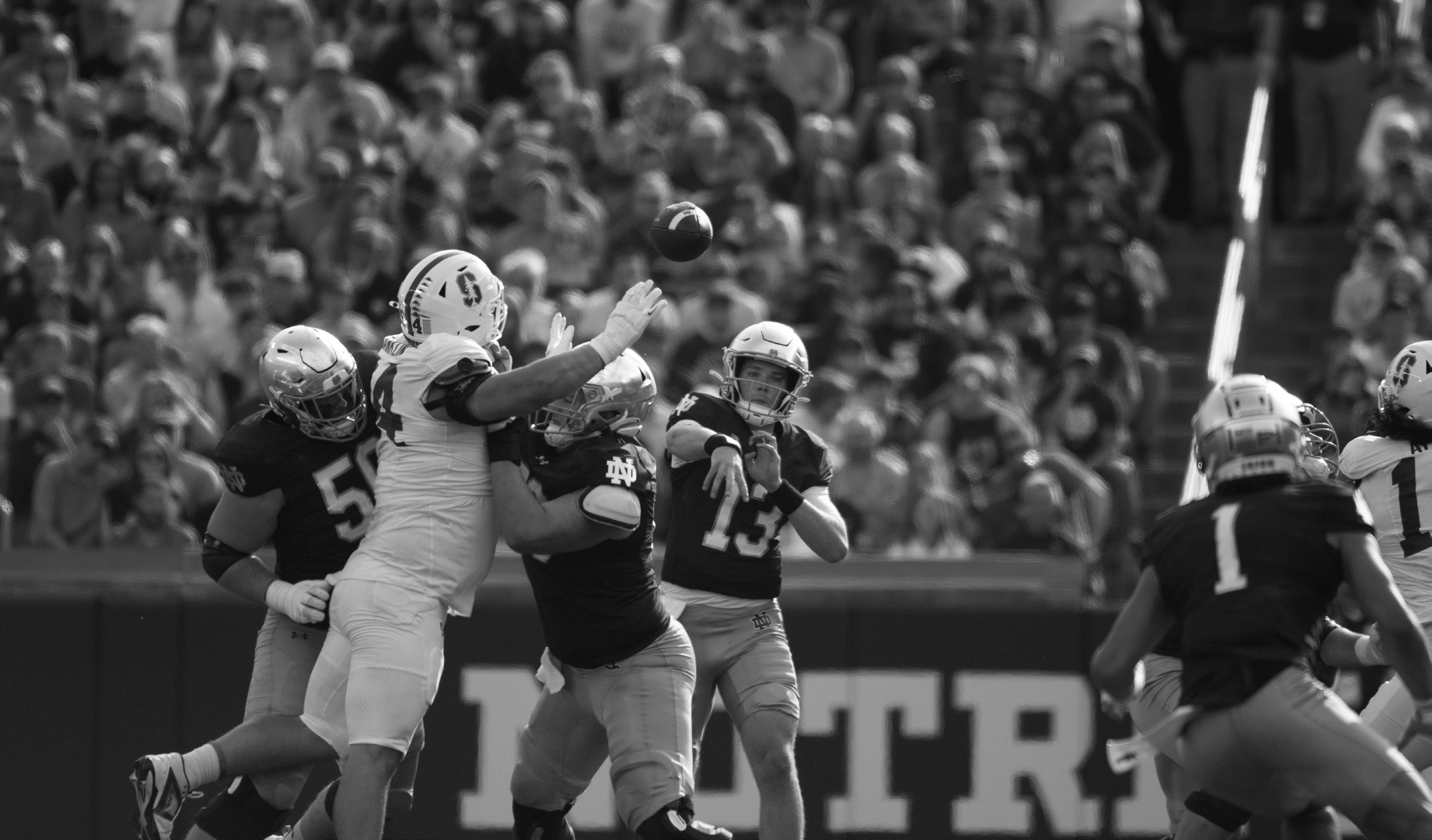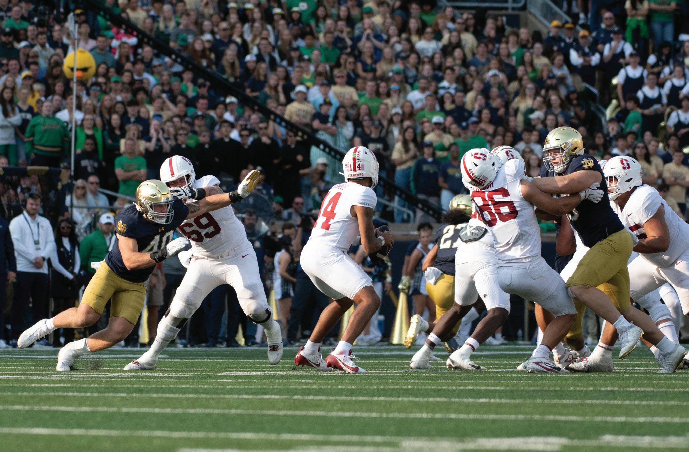 offense were able to take, albeit against a weak and inexperienced Cardinal secondary. Playing an opponent built to stop the run, offensive coordinator Mike Denbrock drew up the perfect game plan, attacking downfield on early downs and leveraging the RPO against stacked Stanford boxes. Leonard was in control all game, putting together his best throwing performance of the season. The senior transfer went 16 for 22 for a seasonhigh 229 passing yards and four touchdowns, one with his legs and three with his arm, doubling his total for the season. Of Notre Dame’s 477 yards of total offense, 248 came through the air and 229 on the ground, one of its most balanced stat lines all season. The Irish will need to prove they can execute at this level against better competition, but the display was nonetheless encouraging for the future.