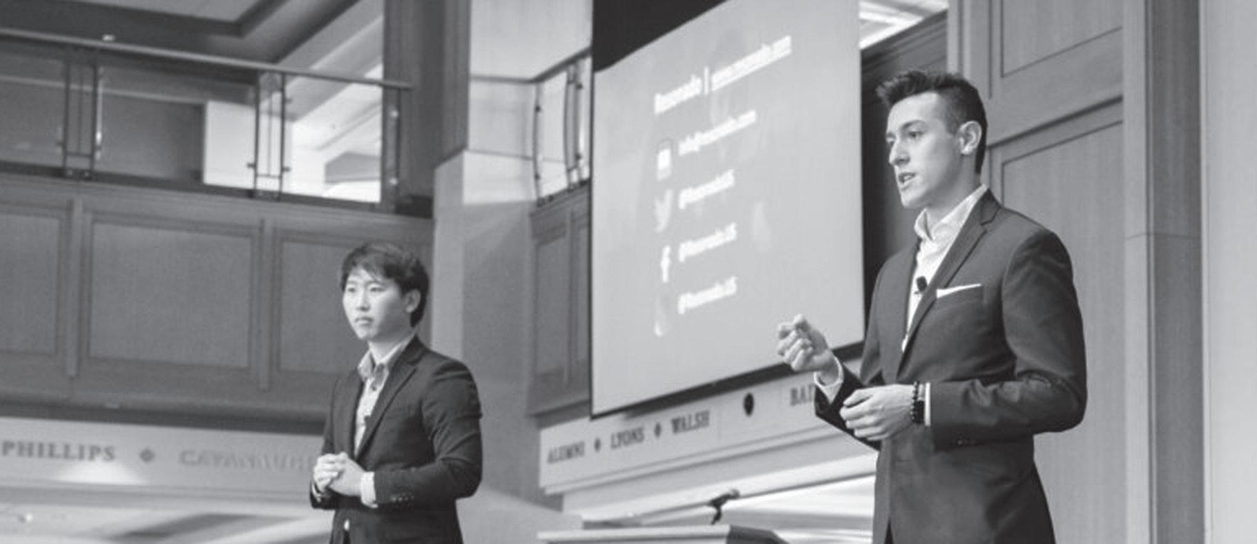 Brian Cho (left) and Erikc Perez-Perez (right) stand on stage while pitching Resonado in the 2019 McCloskey Competition. Resonado split the first-place prize that awarded it a sum of $25,000.