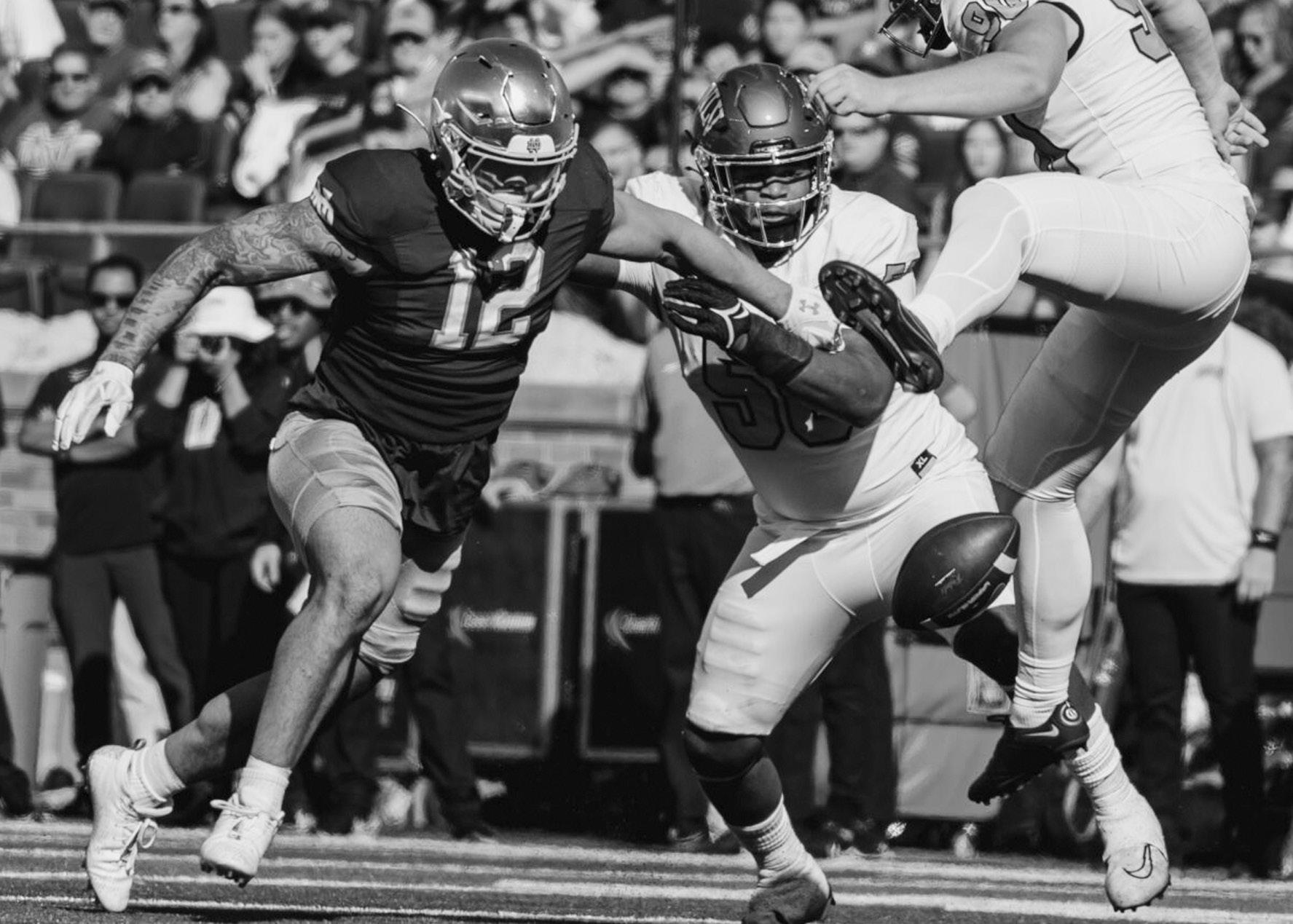 excellent play from special teams helped notre dame cap ture a win against UnLv last weekend and avoid a losing streak. senior defensive linemen Isaiah Foskey was a major con tributor, as his two blocked punts resulted in 10 points for the Irish. Foskey’s feat also made him the first-ever Irish player to block two punts in a single game. This game-altering performance by special teams won praise from head coach marcus Freeman.