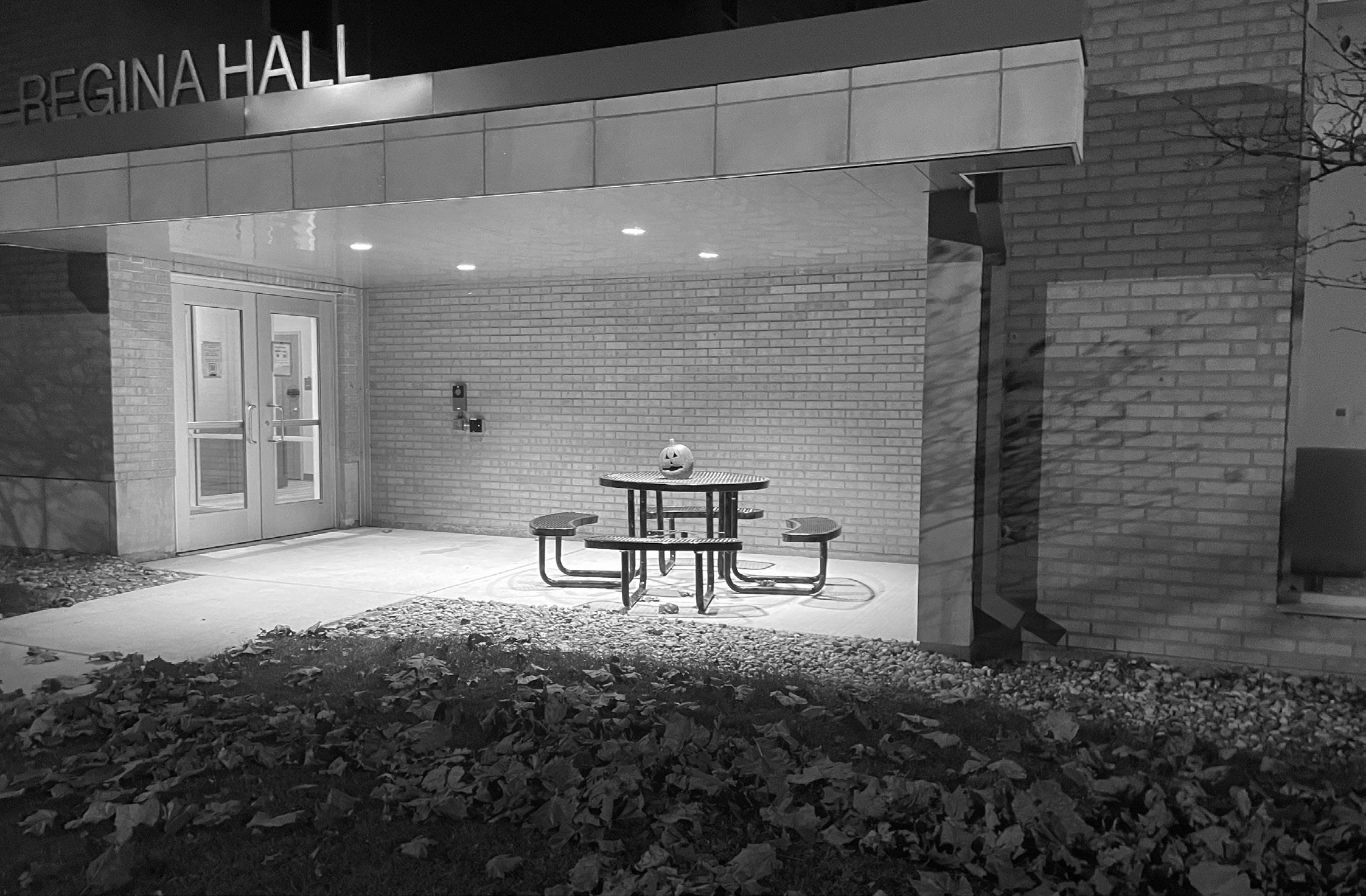 A lone jack-o’-lantern sits on a picnic table outside of Regina Hall at Saint Mary’s. Pumpkin carving and painting stations were available to students in the dining halls at Notre Dame and through club and hall events such as the Keenan Hall Great Pumpkin.