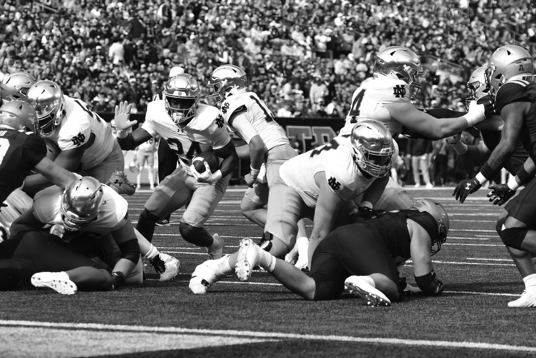 Junior running back Jadarian Price seeks a path to the end zone during Notre Dame’s 51-14 defeat of Navy at MetLife Stadium on Oct. 26, 2024. Price and the Irish rushed for 265 yards against the Midshipmen.