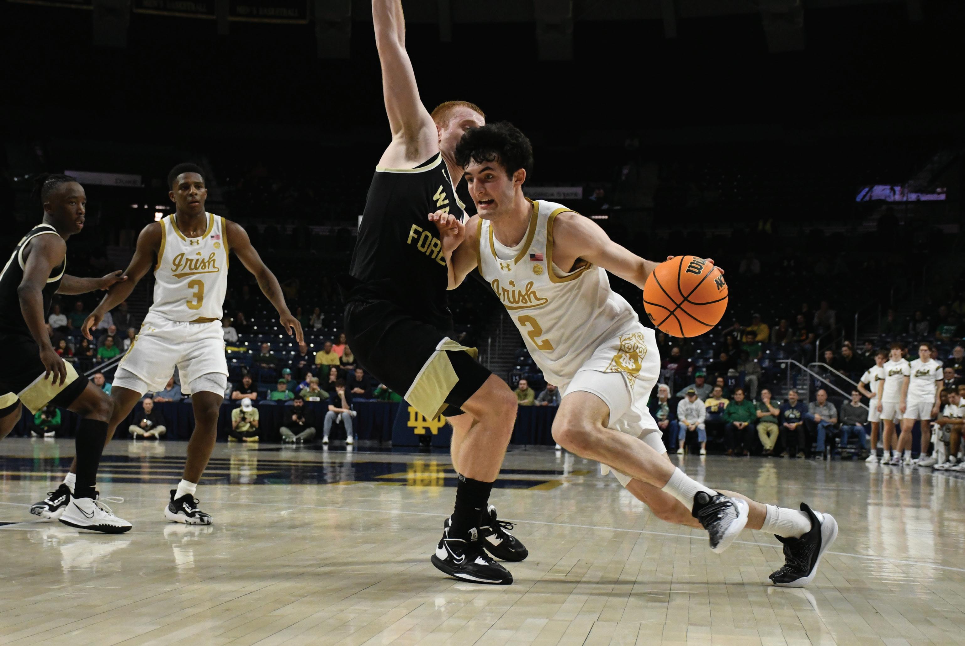 Sophomore guard Logan Imes (2) drives on a defender with the basketball during Notre Dame’s 70-65 defeat of Wake Forest at Purcell Pavilion on Feb. 27, 2024. The Irish went 1320 overall and 7-13 in ACC play last season and this season are projected to finish 10th in the conference by the ACC Preseason Poll. They’ll open play on Nov. 6 against Stonehill.