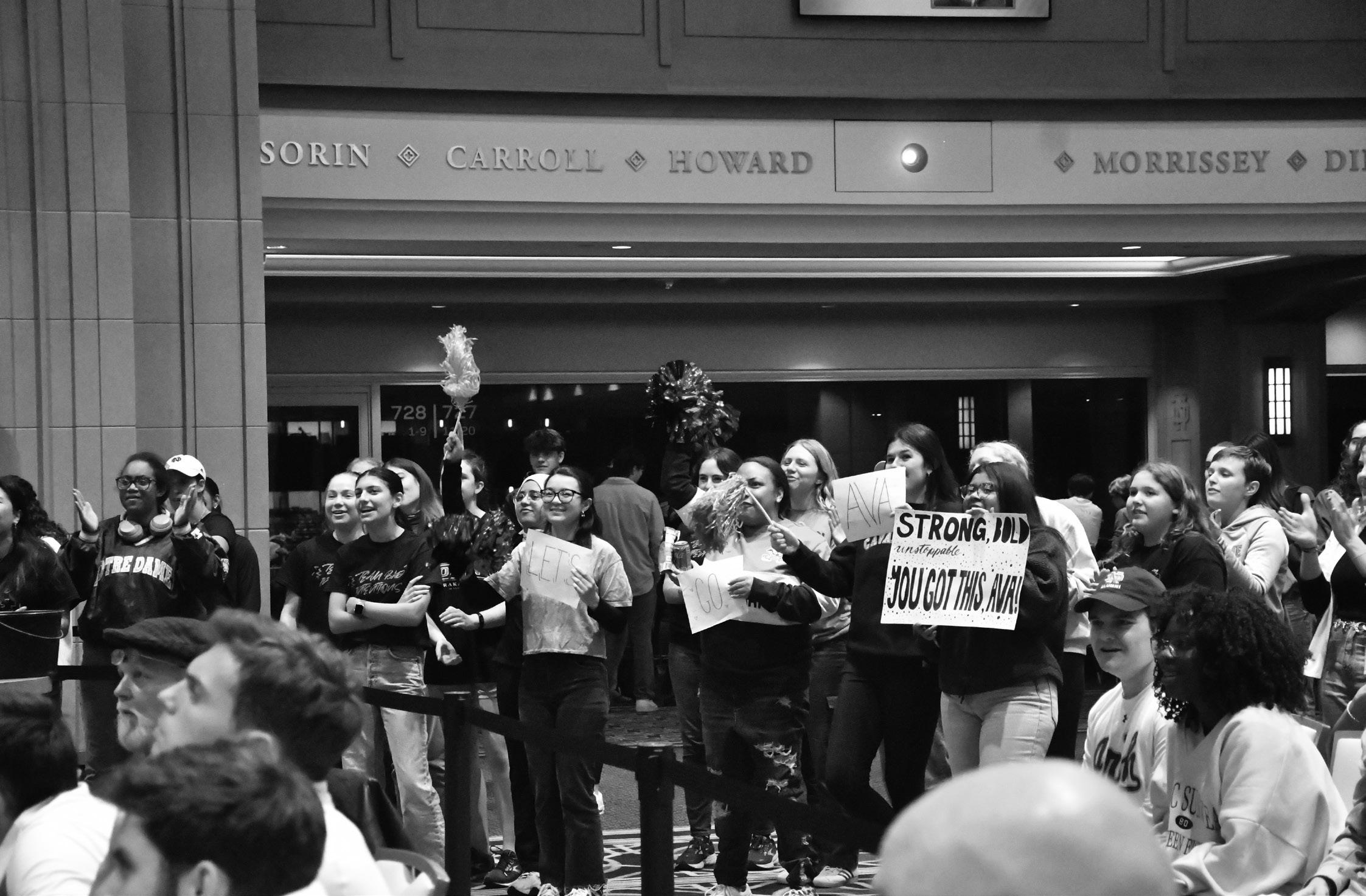 Supporters cheer on a boxer during the Baraka Bouts quarterfinals on Monday, Nov. 11, 2024 in Dahnke Ballroom. Fans brought signs, pom-poms and customized t-shirts to show their support for the students competing in the women’s boxing tournament.