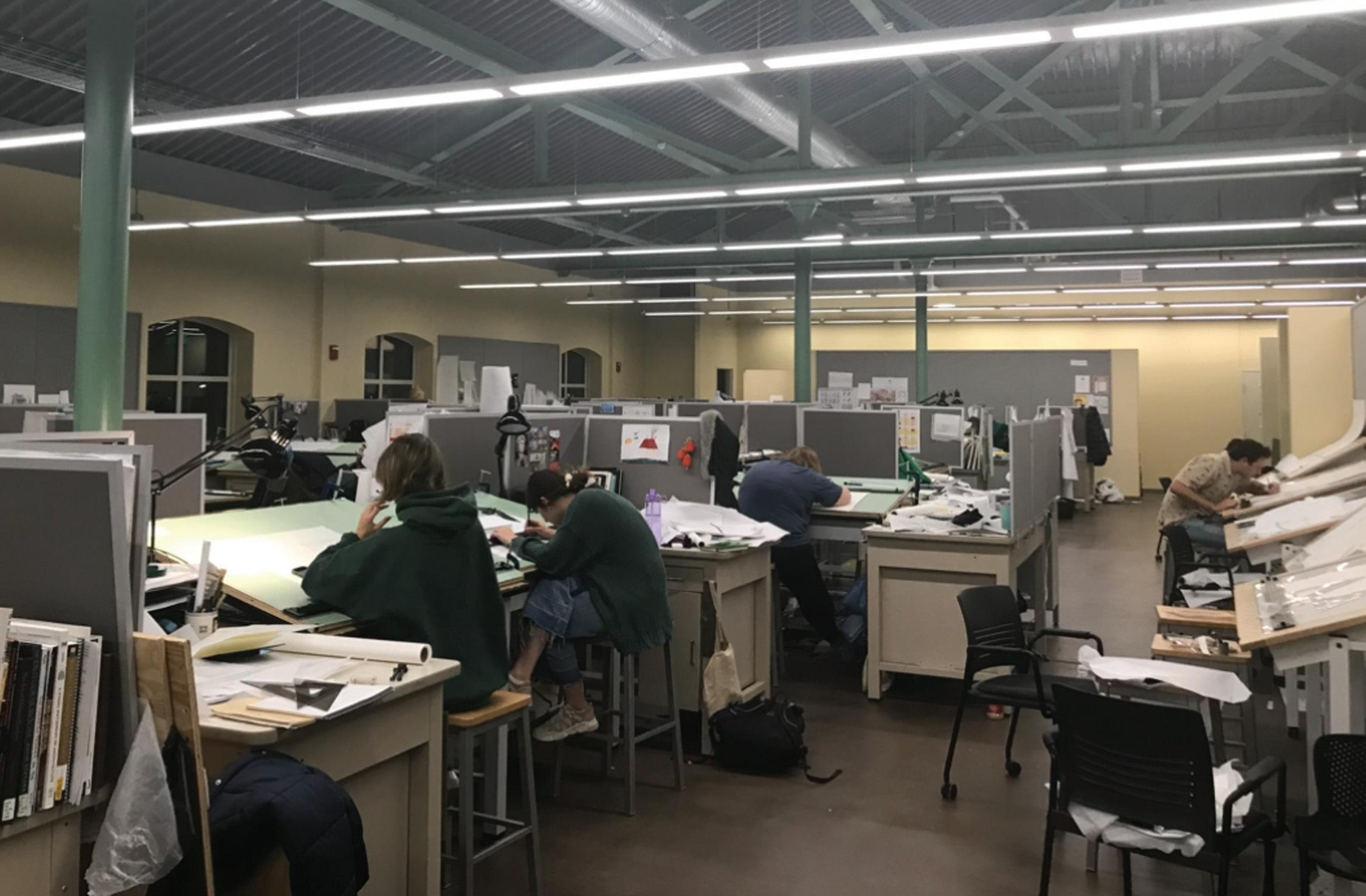 Notre Dame architecture students work late nights in their studio as project deadlines approach. Weeks of planning and drawing