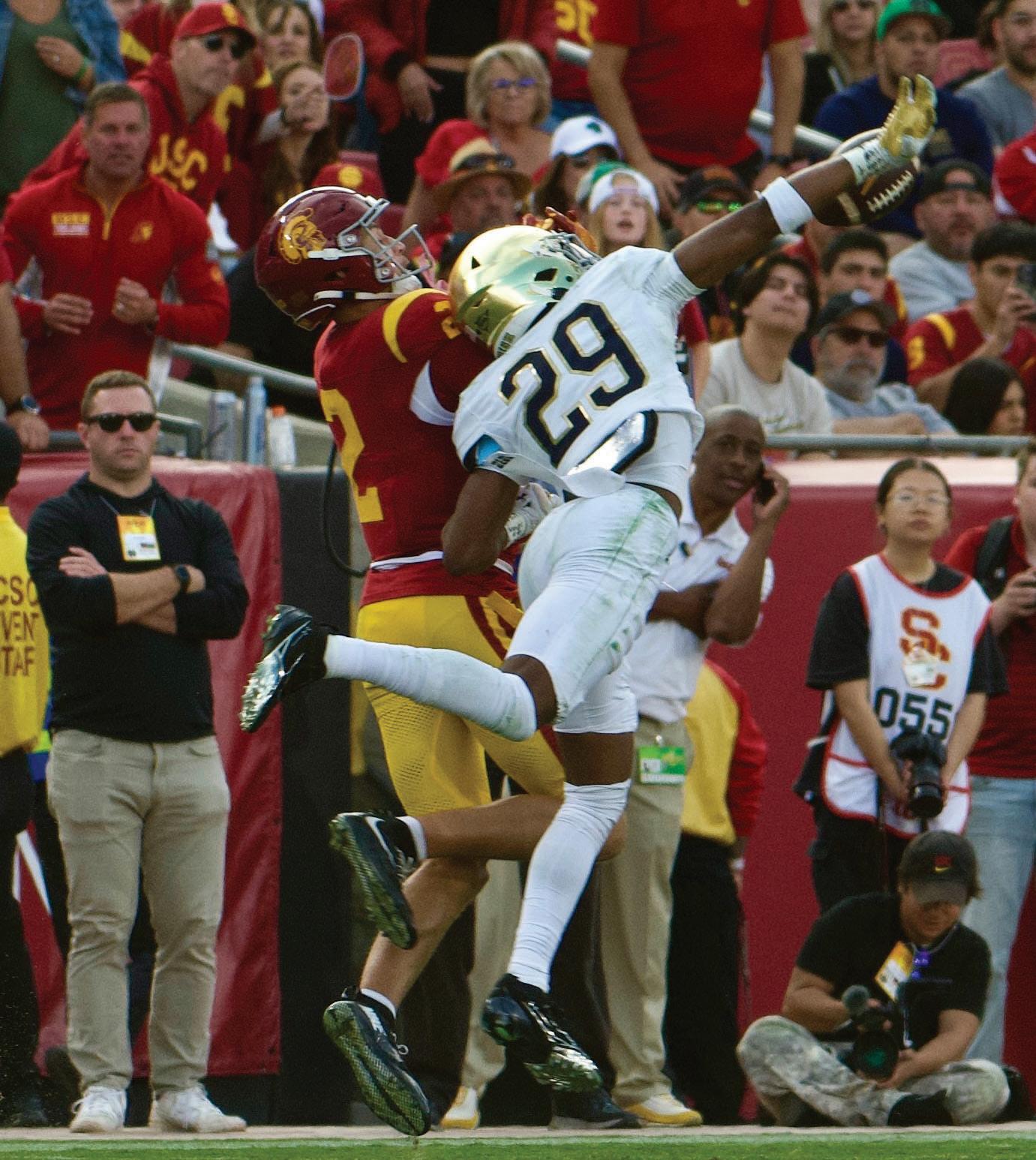 But the momentum briefly swung back to USC when Leonard’s deep pass intended for graduate wide receiver Kris Mitchell was intercepted by Anthony Beavers Jr., who returned it to the Notre Dame 45yard line. However, the Trojans failed to capitalize as dropped passes and graduate safety Xavier Watts’ strong defensive presence halted their progress.