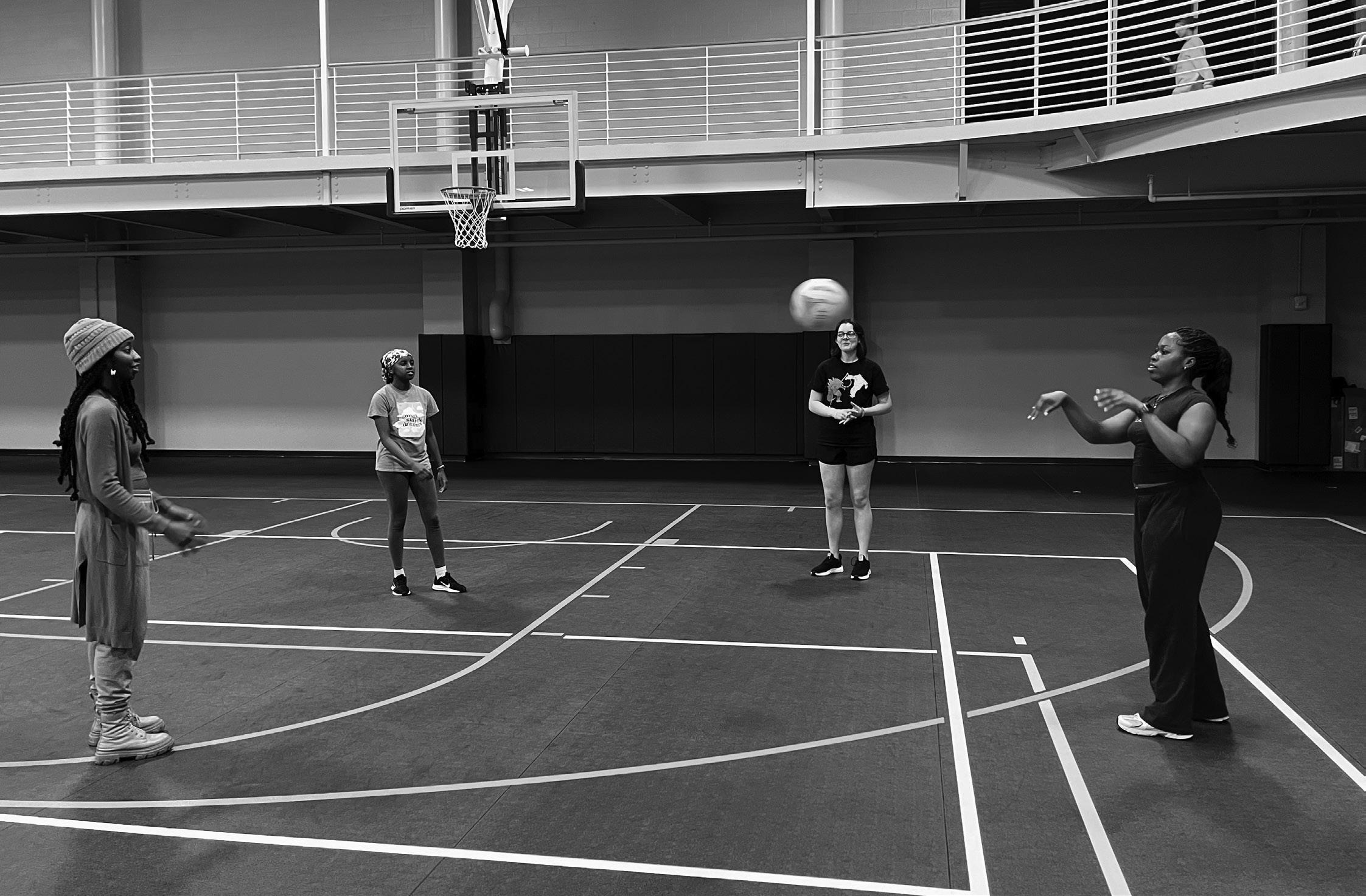 Saint Mary’s College netball club members Sheila-Marie Manyara, Chinaza Ezechikamnayo, Jo Houin and Diodivine Nso practice with each other. The club met for their final practice of the fall semester in Angela Athletic and Wellness Complex on Tuesday.