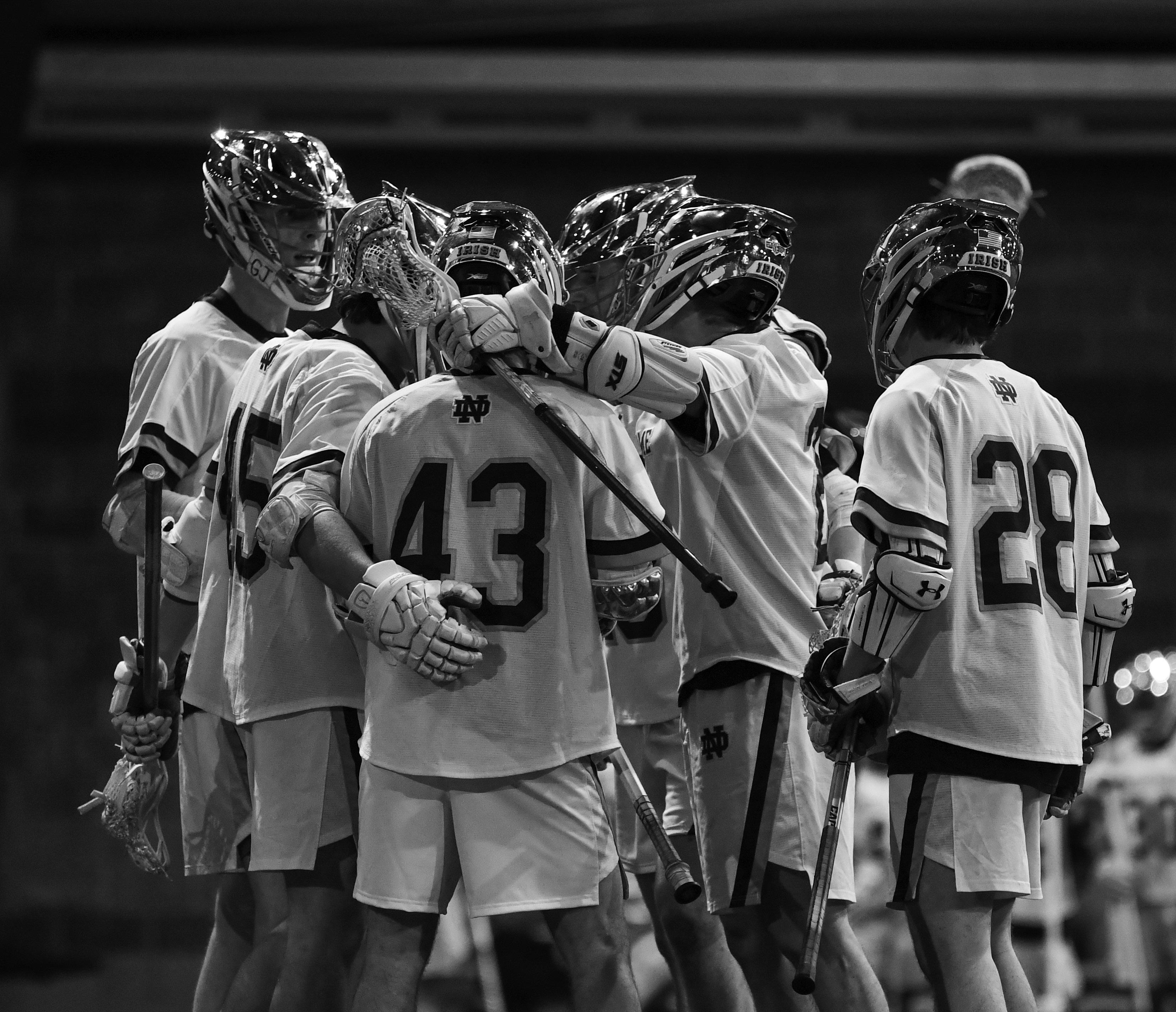 Members of the Notre Dame men’s lacrosse team gather during a 25-3 defeat of Cleveland State at Loftus Sports Center on Feb. 14, 2024. The Irish will again begin their season at home against the Vikings with a 6 p.m. game on Wednesday, Feb. 12, opening their second national title defense campaign after capturing ACC and NCAA Championships last year.
