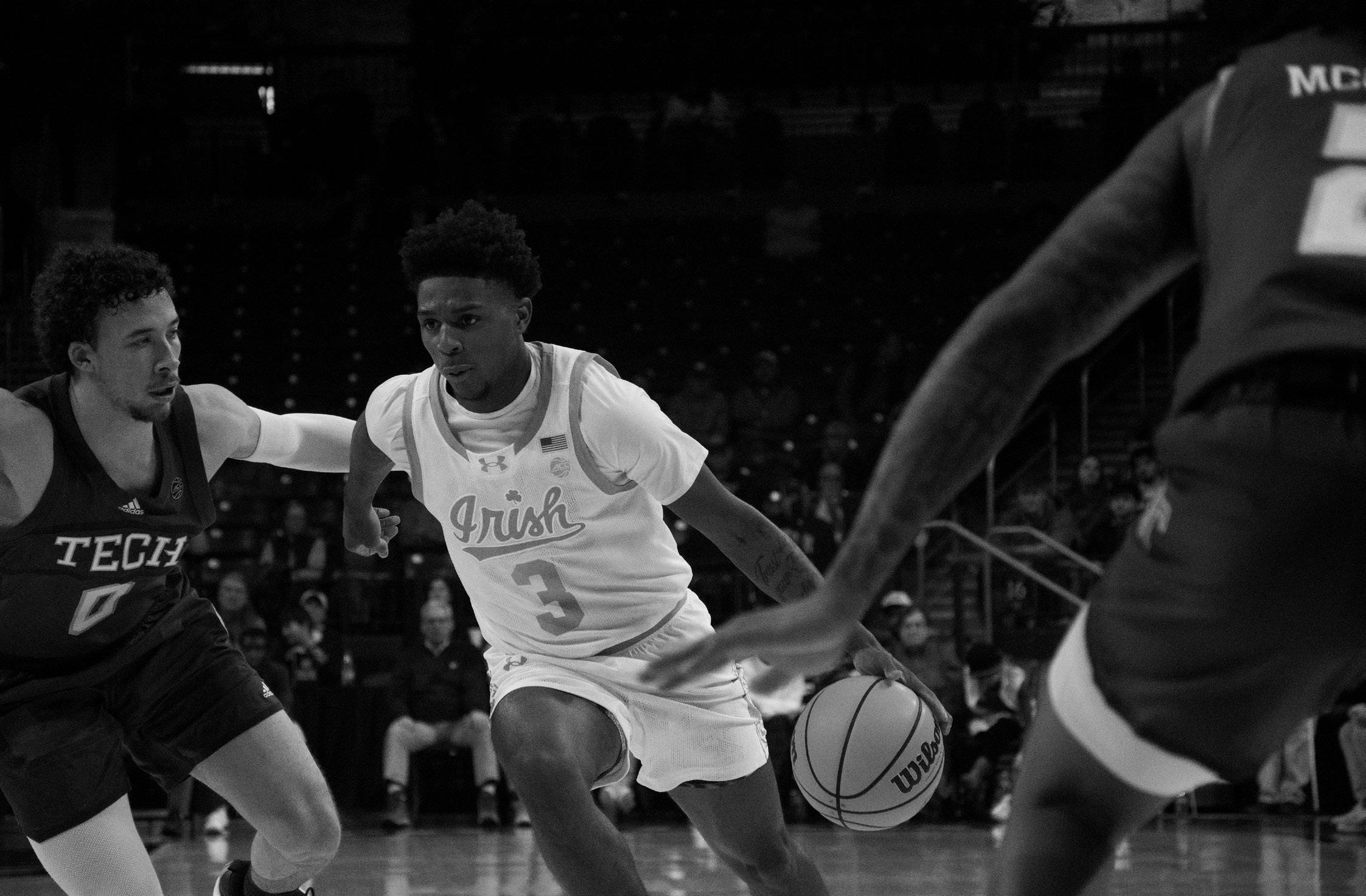 Markus Burton drives to the basket in a hard-fought 71-68 victory over Georgia Tech at Purcell Pavilion on Jan. 28. Notre Dame men’s basketball continues their ACC play (4-6), but fell to Miami 63-57 after a second-hal f collapse on Feb. 1 in Coral Gables.