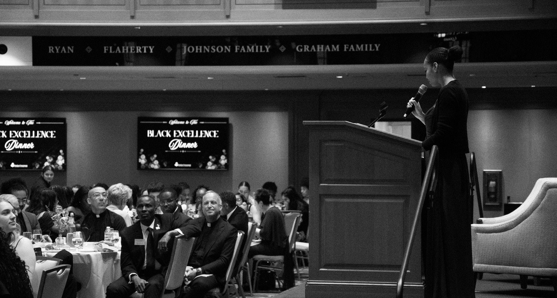Students, faculty and staff listen to speakers celebrating Black excellence in Dahnke Ballroom of Duncan Student Center. The dinner event honored those who have demonstrated Black excellence at Notre Dame.