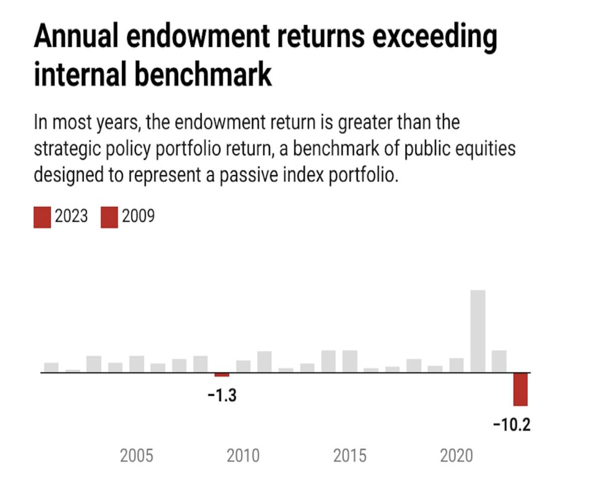 Since 2000, the endowment has earned higher returns than the internal benchmark except in 2009 and in 2023. More than a decade has passed since the endowment return did not exceed the strategic policy portfolio. In 2009, the comparison portfolio returned -19.5% while the endowment returned -20.8%. This year’s underperformance is much larger. The report notes that the strategic policy portfolio can have low short-term correlations with the endowment.