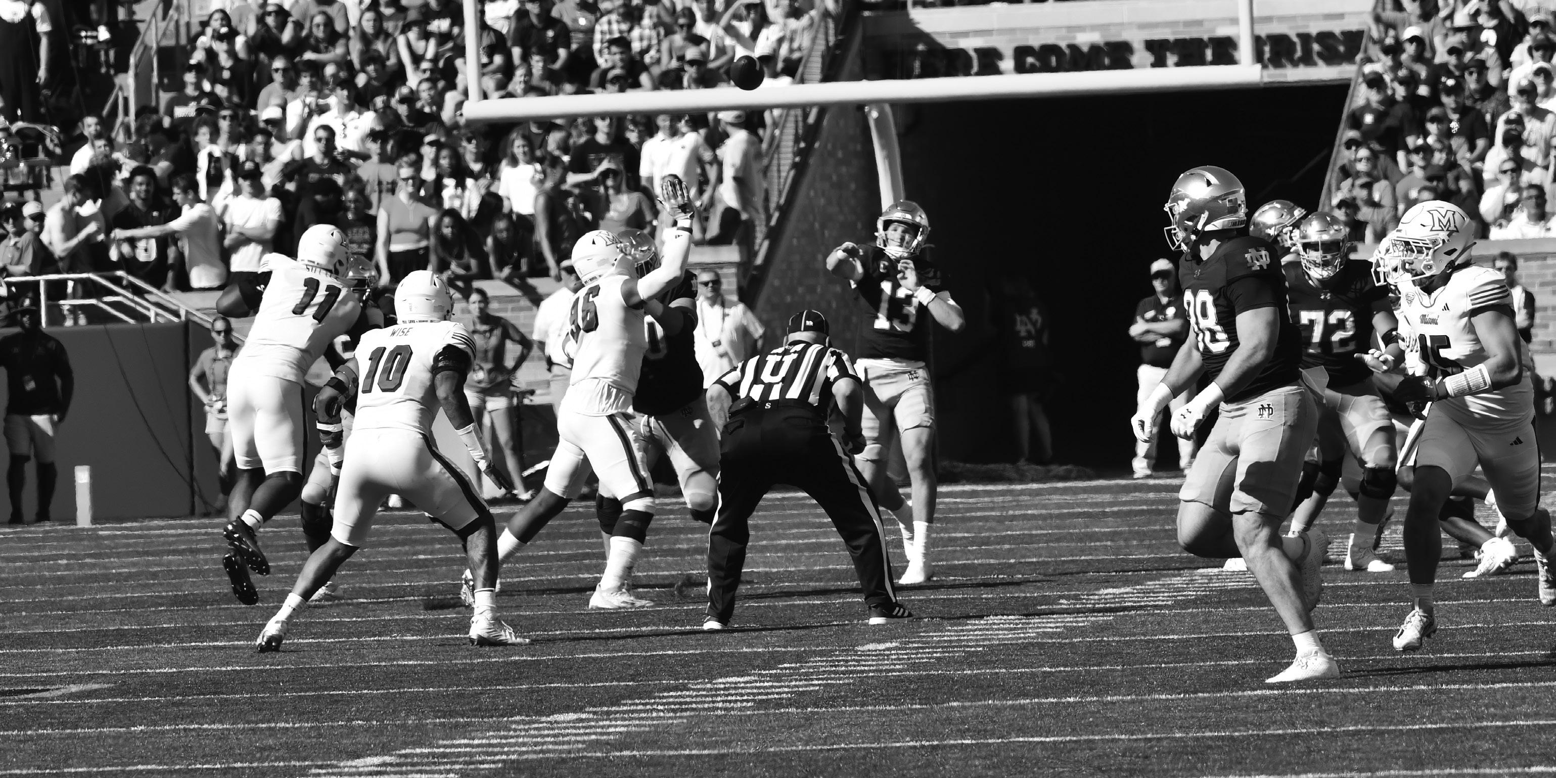 On the other side of the coin, Notre Dame’s passing attack, specifically the lack of air yards, has left a great deal to be desired. In this day and age, a strong passing game is absolutely essential for a team that wants to be as dominant as the Irish believe they can be. With offensive weapons like sophomore wide receiver Jaden Greathouse, senior tight end Mitchell Evans and a strong receiving core all around, one would think this should be fairly easy to achieve. However, the relatively green and injury-ravaged Notre Dame offensive line has not protected the pocket long enough for deep routes to develop. While the offensive line’s inexperience has bought the group a little leeway as they struggle to improve their pass protection, that leeway is quickly running out. It took less than a quarter for chants of “Throw the ball!” and “We want Steve!” to start up in the