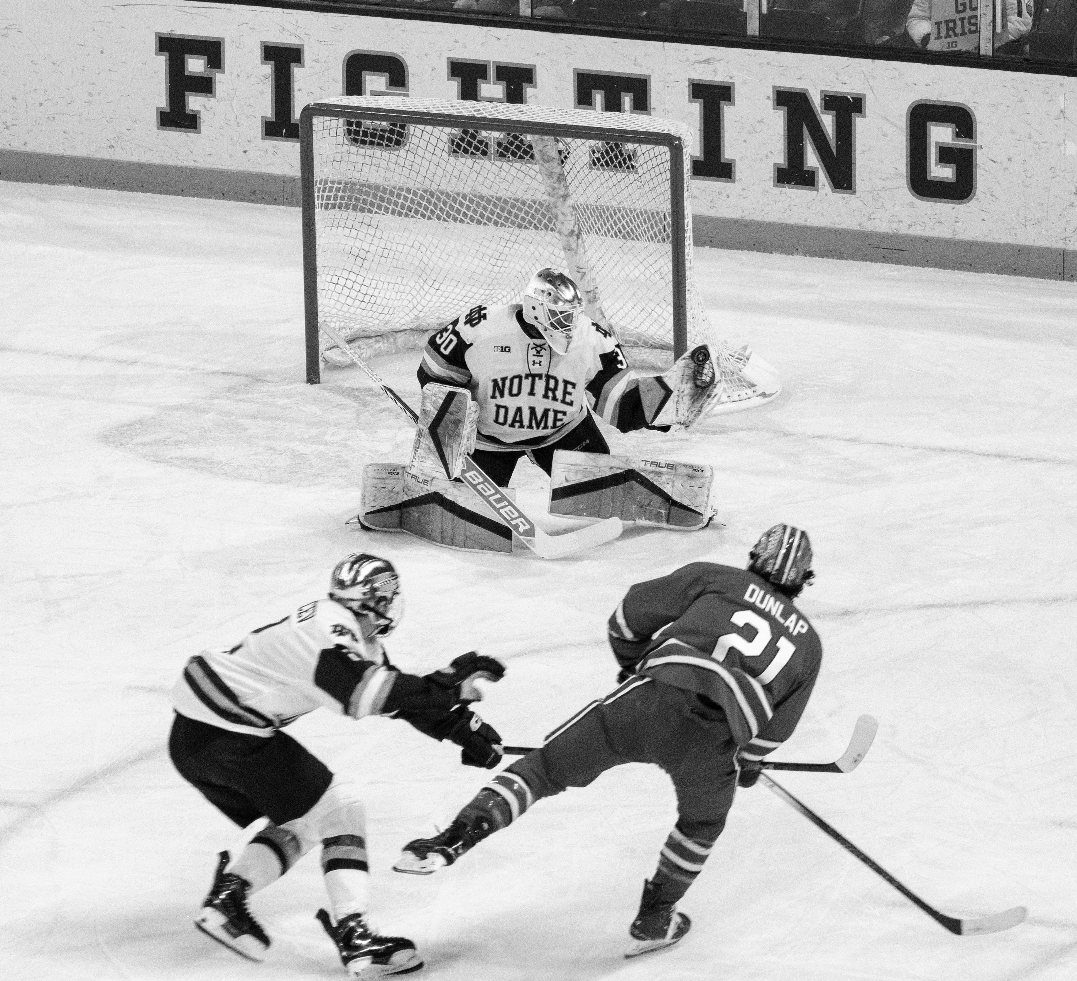 reflected that. Notre Dame struck first at 4:50 of period one, as a perfectly placed dump-in from Kumlin ricocheted off the corner boards and found junior winger Niko Jovanovic, who blasted home his first career goal.