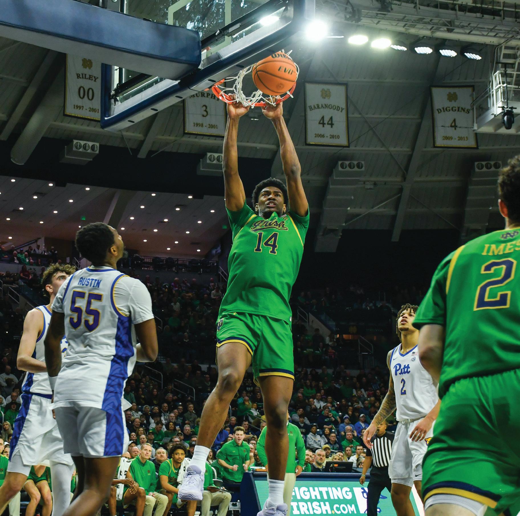 Junior forward Kebba Njie dunks the basketball during Notre Dame’s 76-72 defeat of Pittsburgh at Purcell Pavilion on Feb. 22, 2025. Njie totaled 8 points in the Irish victory, helping Notre Dame improve to 12-15.