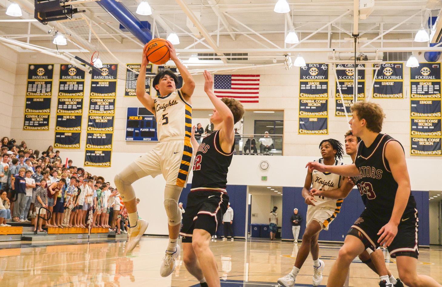 Freshman guard Ethan Love goes up for a contested layup during Menlo’s matchup with SHP in January. Staff photo: Noah Levin