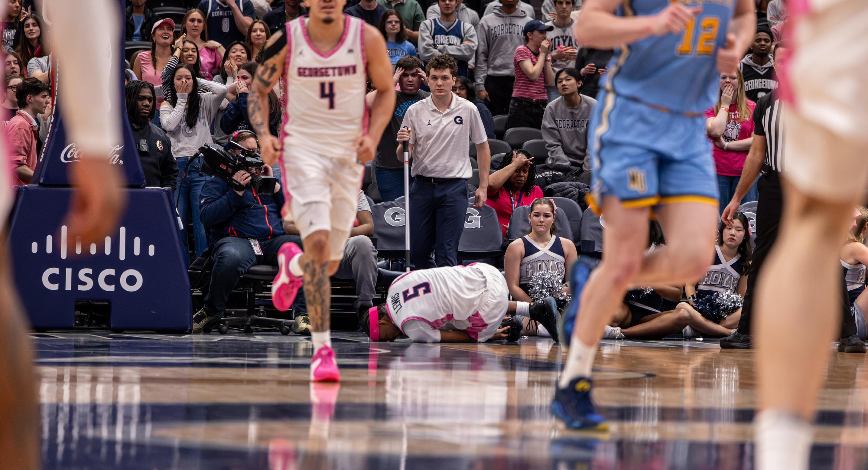 Georgetown University men’s basketball junior guard KJ Lewis injured his ankle in the Hoyas’ Feb. 24 loss to the Marquette University Golden Eagles and will miss the remainder of the 2025-26 season, Georgetown Athletics announced Feb. 26. Lewis exited the game with 4:36 remaining in the first half after appearing to injure his lower leg while attempting to grab a rebound. Lewis laid on the court holding his ankle and was helped off the court by staff. He did not play for the rest of the game and returned to the bench in the second half using crutches.