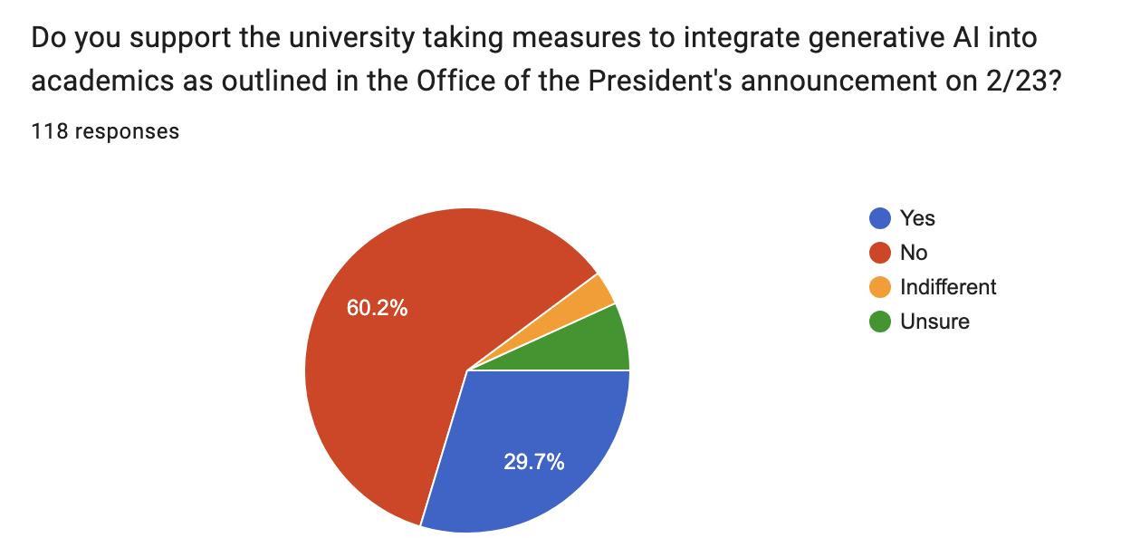 In order to gauge student opinion, students were asked if they support the university taking measures to integrate generative AI into academics as outlined in this announcement. Of 118 responses, 60.2% said no, 29.7% said yes, 6.8% said unsure and 3.4% said indifferent.