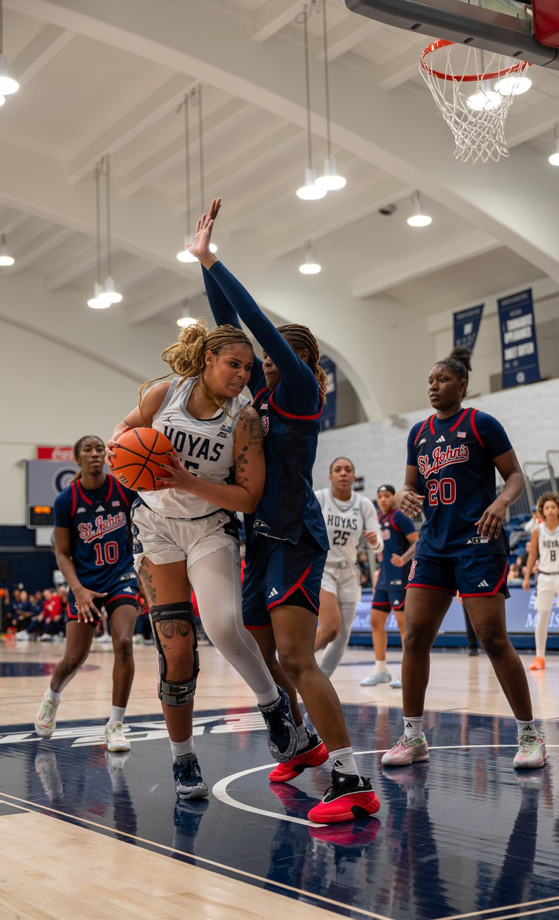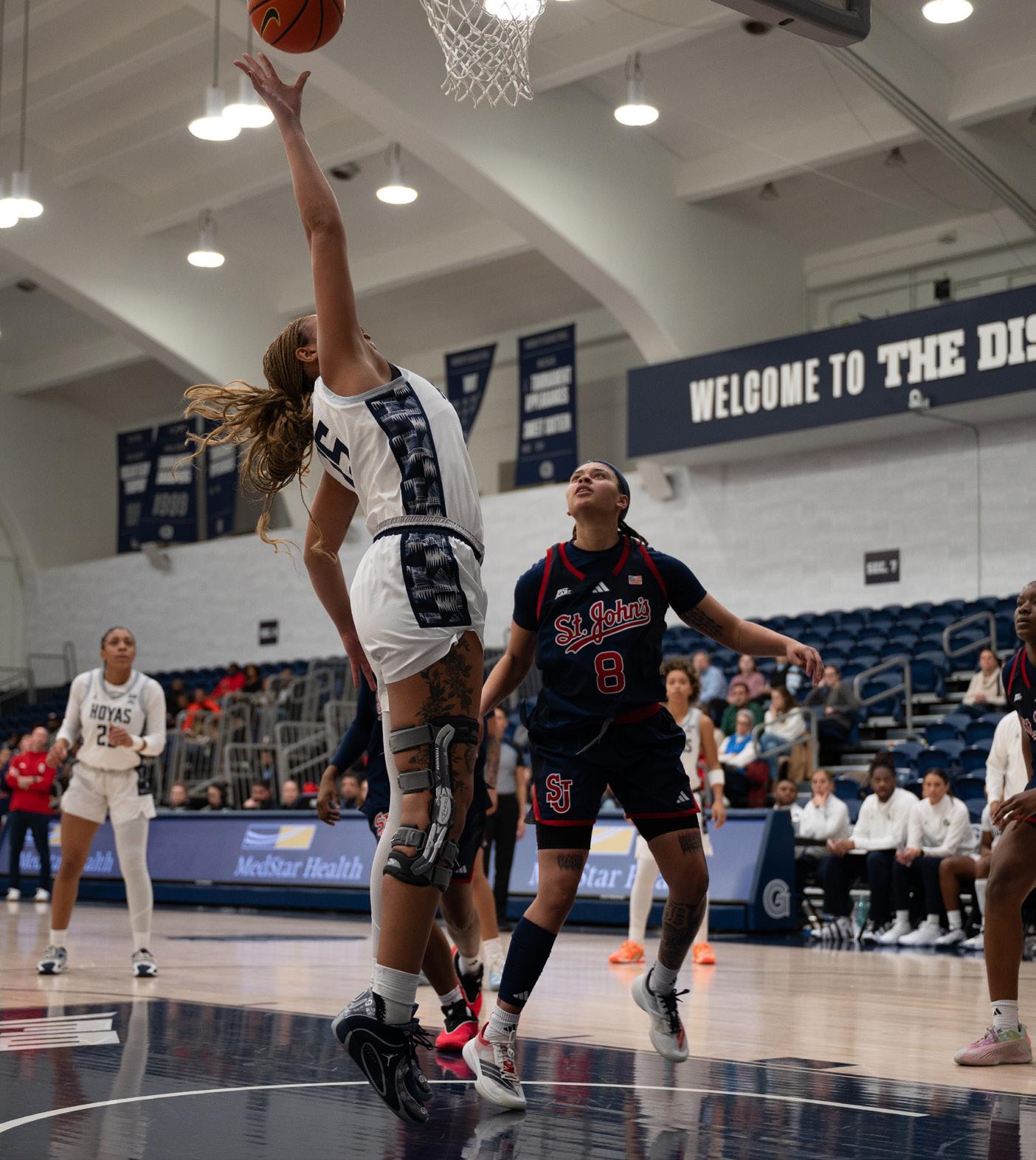 The Georgetown University women’s basketball team dominated the St. John’s University Red Storm in McDonough Arena on Jan. 13, buoyed by a pair of 11-0 runs. The Hoyas (10-7, 3-5 Big East) outscored the Red Storm (14-5, 4-4 Big East) in every quarter, outrebounded St. John’s 40-26 and made 27 points of turnovers en route to a decisive 59-34 victory. Graduate forward Brianna Scott secured the tip off for the Hoyas, and